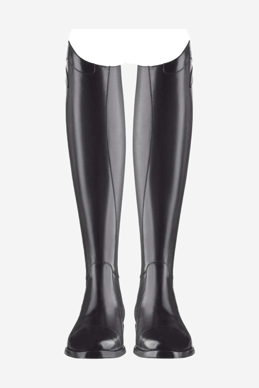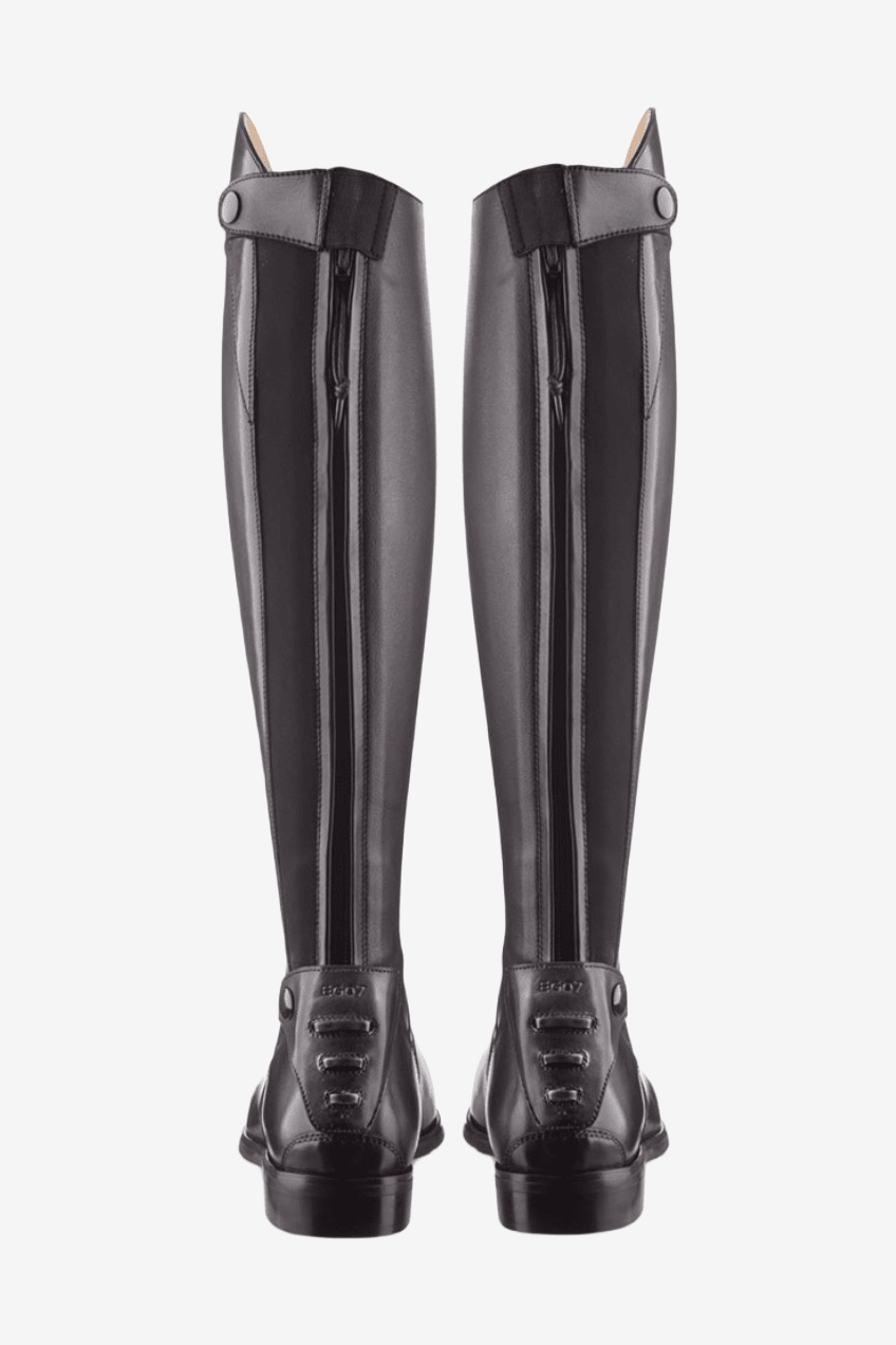 The boots are made from high-quality full grain leather and feature extra soft leather over the instep for increased comfort. A full-length zipper at the back made from extra strong material with elastic provides stable and high comfort with freedom of movement and a fit similar to a custom-made boot. On the inside of the calf, the full grain leather has been replaced with the innovative and very durable E-tex material. This not only protects the calf better but also provides excellent grip and contact with the horse and saddle. At the back, there is a plastic spur rest with three different positions for the spur, keeping it securely in place.
