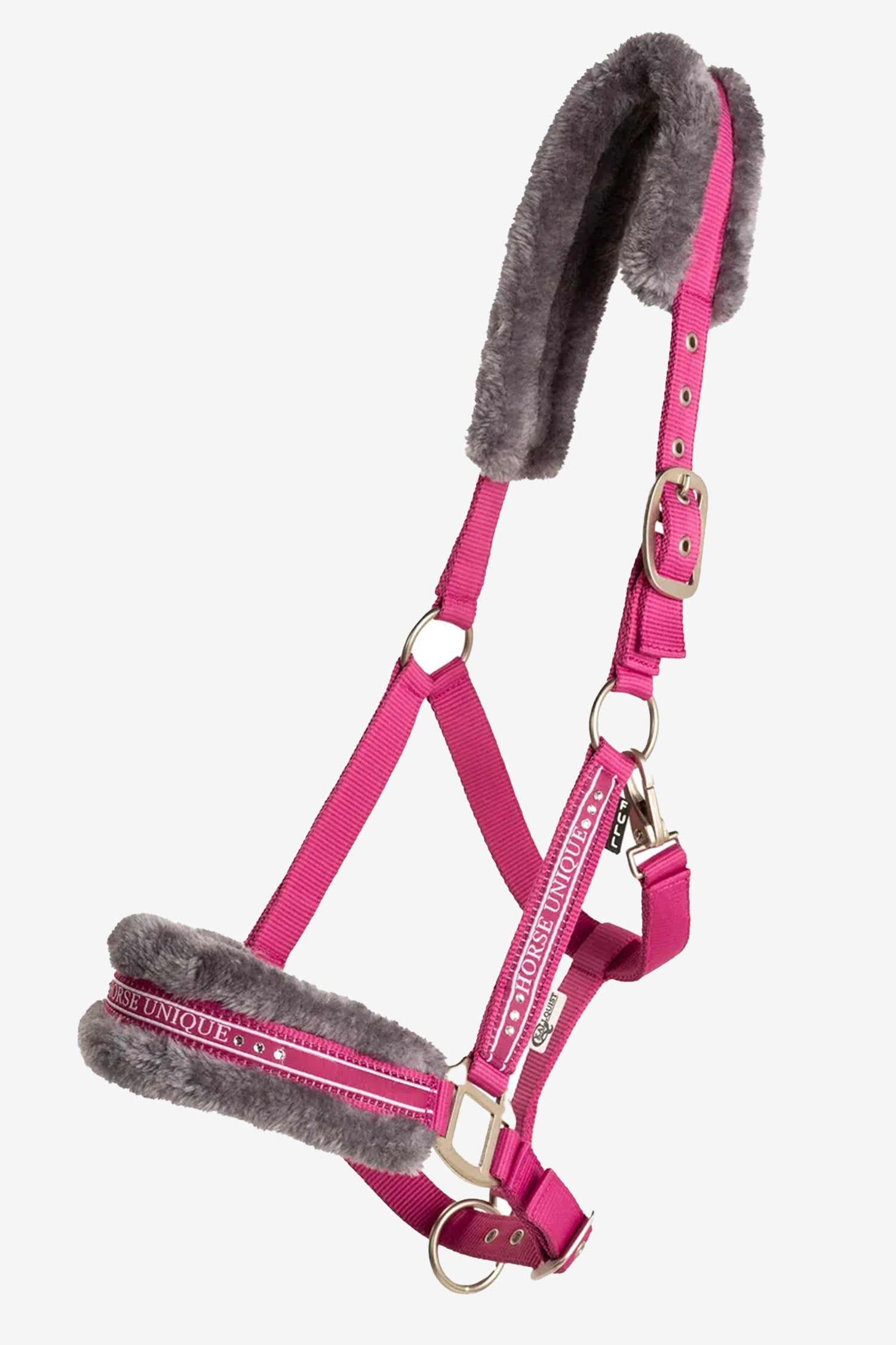 Halter in a stylish color with soft fur at the nose and neck to prevent chafing. Stones on the sides and nose. The size is easily adjustable at the neck and noseband with buckles in matte silver.