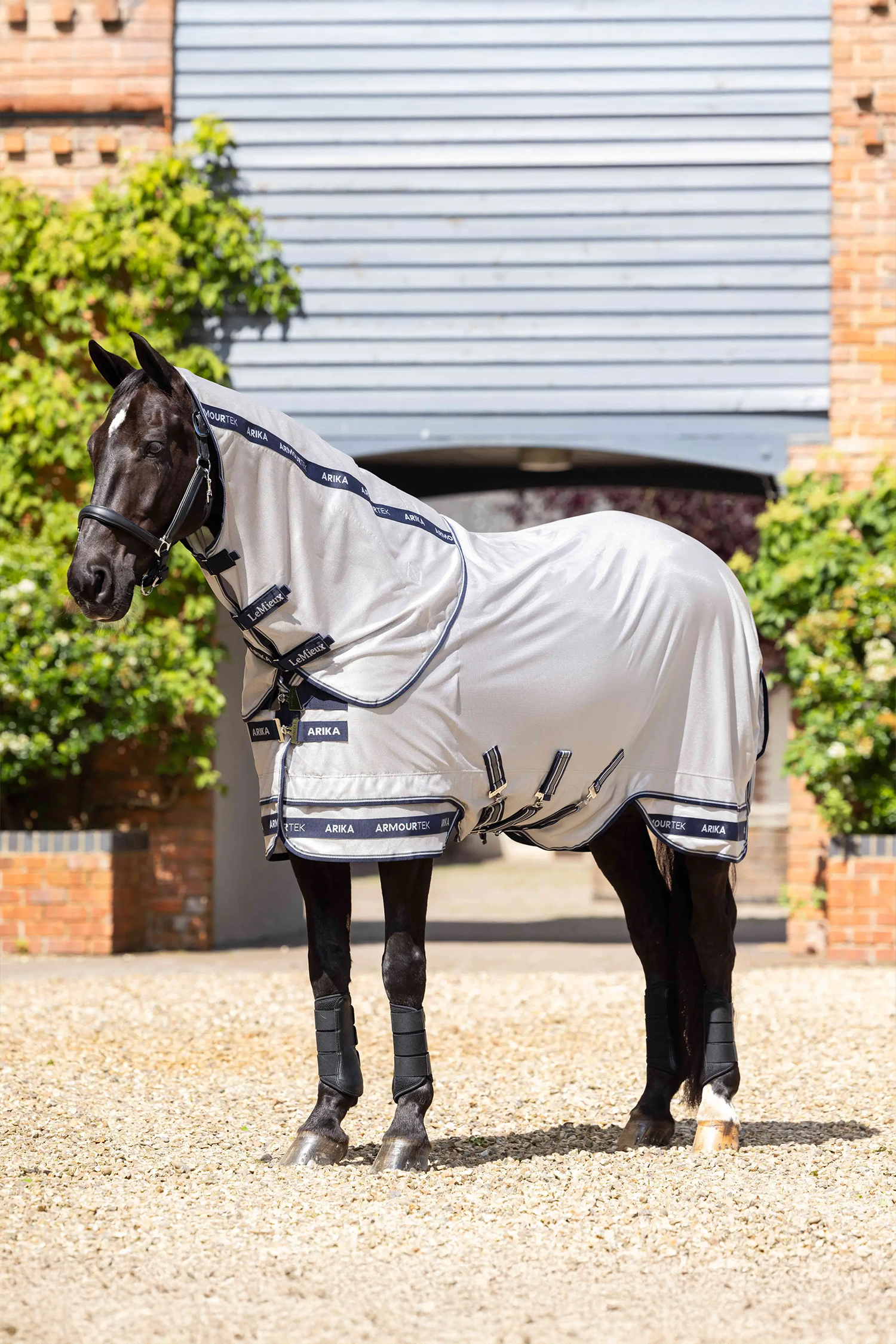 The Arika Armour-Tek Fly Rug is an ultra-lightweight fly rug developed for technically advanced insect protection on warm days. With 85 percent UV protection, the rug helps shield the horse from the sun's effects while serving as an effective barrier against flies and other insects in the paddock and stable.