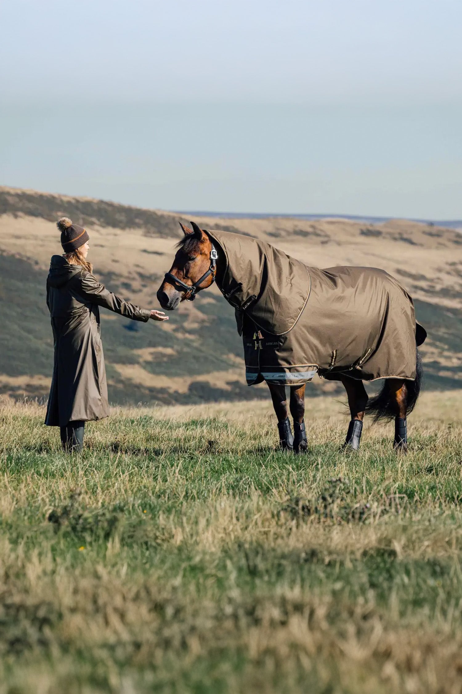 The outer fabric in 600 denier ripstop has a waterproof rating of 10,000 mm and a breathability of 3,000 mvp. The seamless back reduces the risk of leakage, while an antibacterial and antistatic lining at the shoulders helps the rug stay in place, prevents chafing, and gives a nice shine to the coat.
