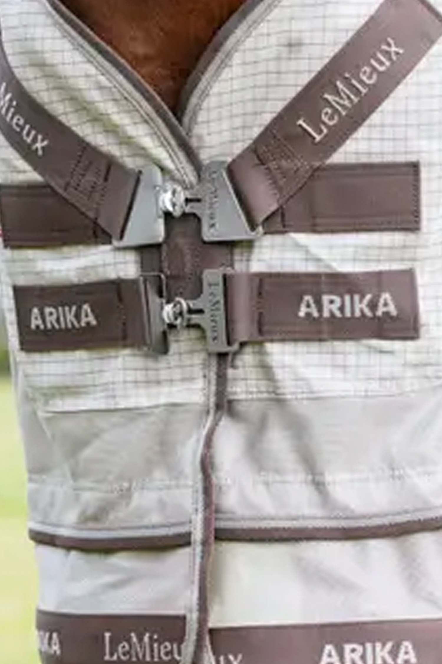 Like the other rugs in the Arika collection, this model is equipped with LeMieux's patented two-part front skirt and a 45° angled T-bar front closure. The construction provides maximum shoulder freedom and allows the horse to move freely during both play and grazing.