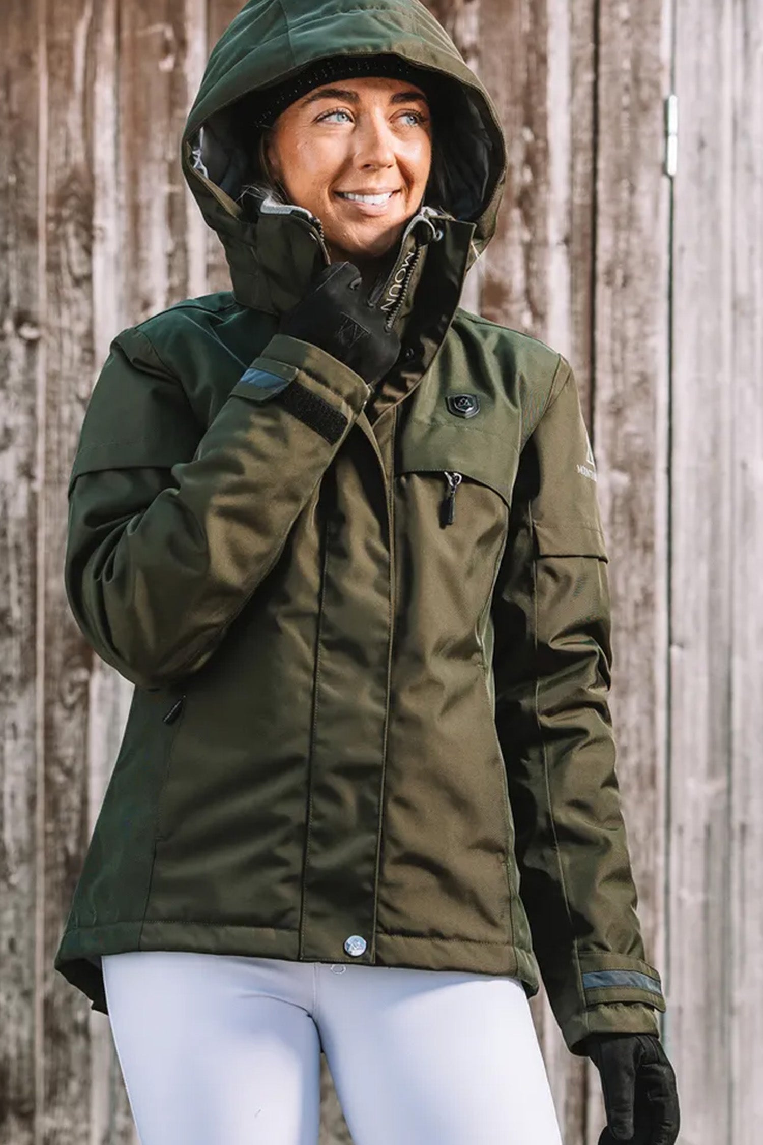 Updated classic from Mountain Horse – a women's jacket for riding in all weather conditions. The stylish, feminine fit is combined with smart functional features that keep you warm, dry, and flexible in the saddle. The image shows the protective hood and the clean, sporty look that works just as well in the stable as on a hack.