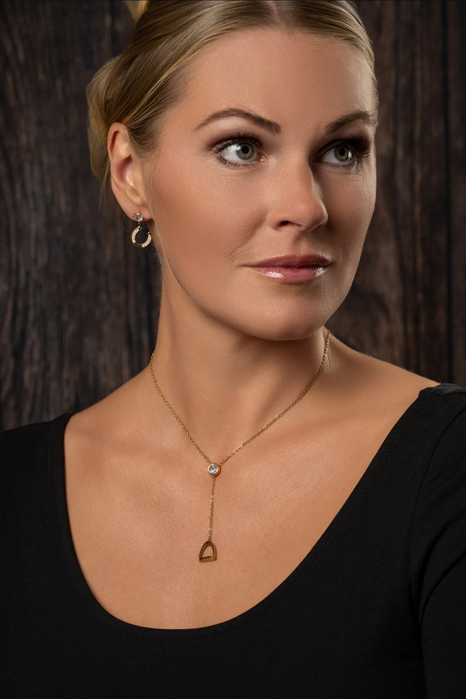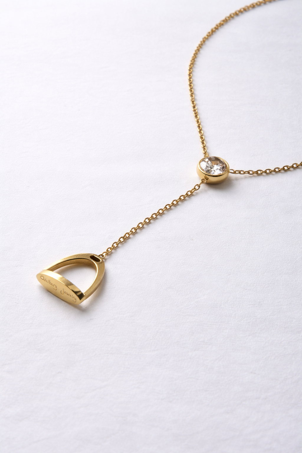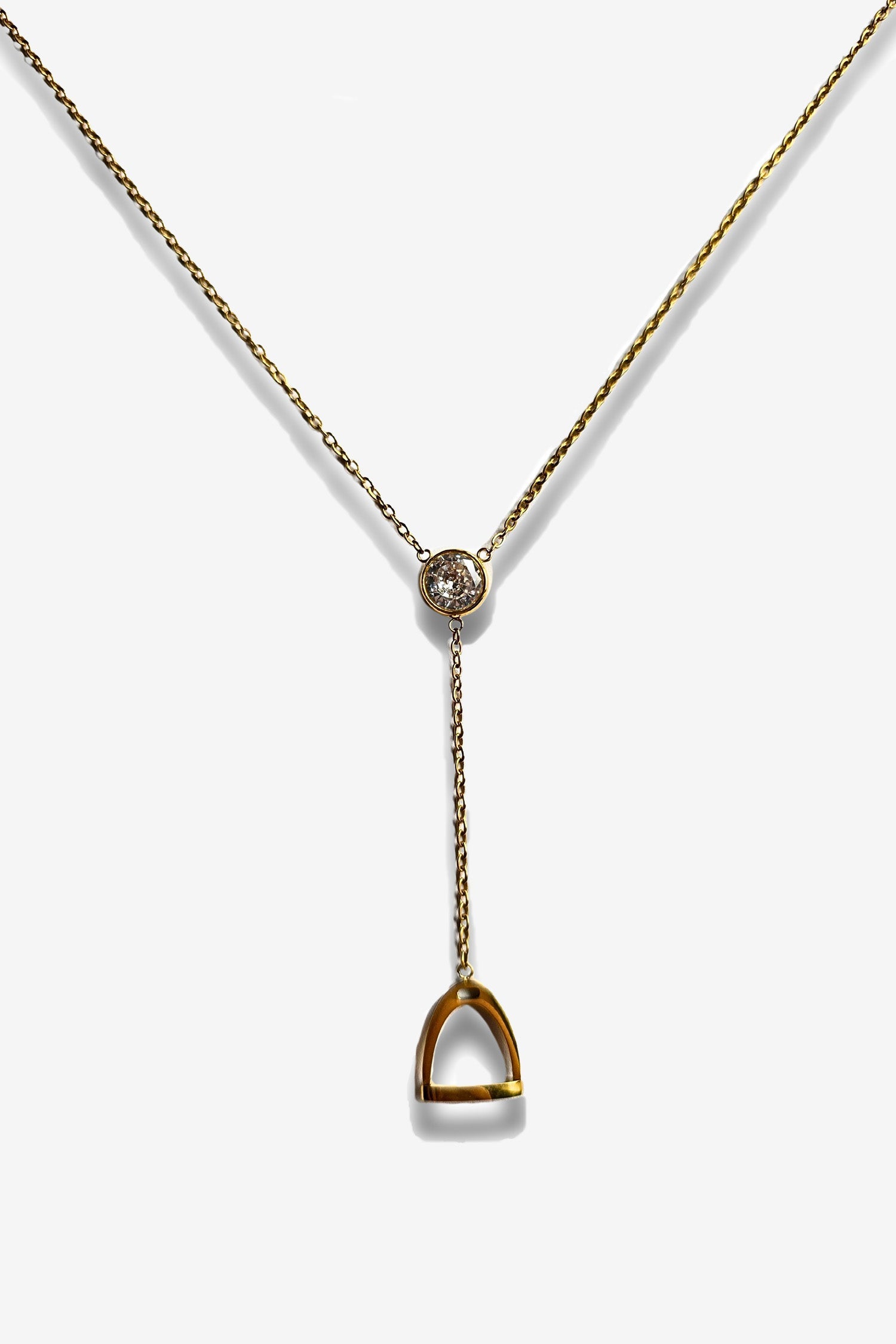 This necklace combines a shimmering stone with an elegantly designed stirrup that hangs beautifully from the chain. The design offers a sophisticated look that works just as well for everyday wear as for more dressed-up occasions.