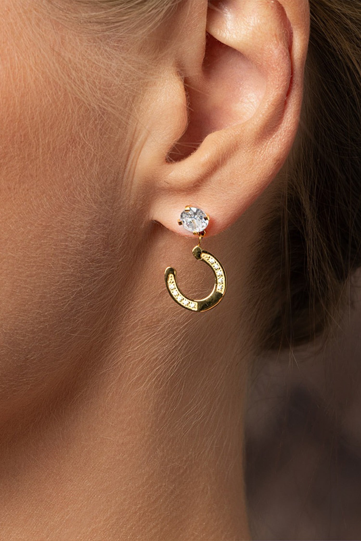 Sparkling earrings shaped like a horseshoe, designed with a larger stone at the ear and small glittering stones following the line of the horseshoe. The result is a pair of elegant and light-reflecting earrings that attract attention without feeling excessive.