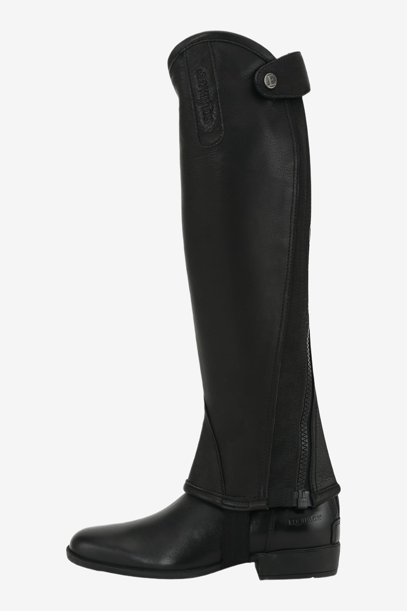 Short chaps made of soft aniline leather for a great fit. Strong elastic along the entire chap. The zipper is curved, running diagonally from the outside up to the back of the knee. Fastening at the top with a snap button. Fits the legs very nicely!