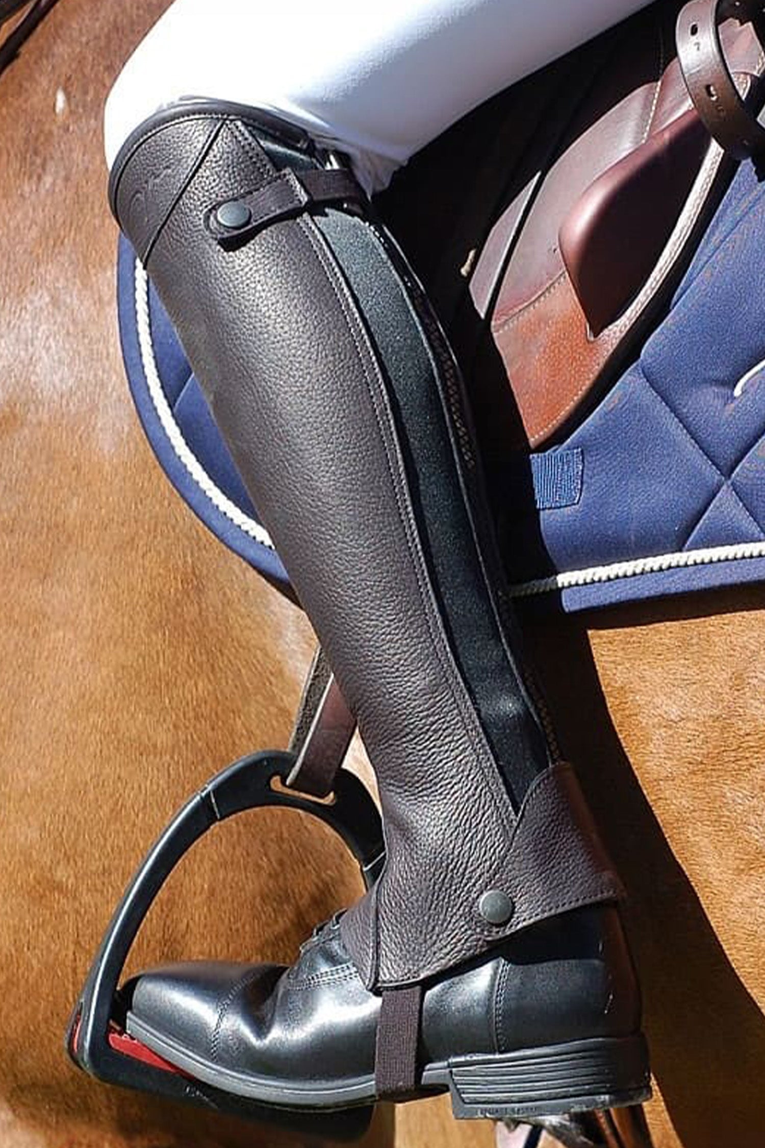 Short chaps in soft full-grain leather from Dyon with a fantastic fit. The leather is 2mm thick and provides a good grip in the saddle with a close feel.