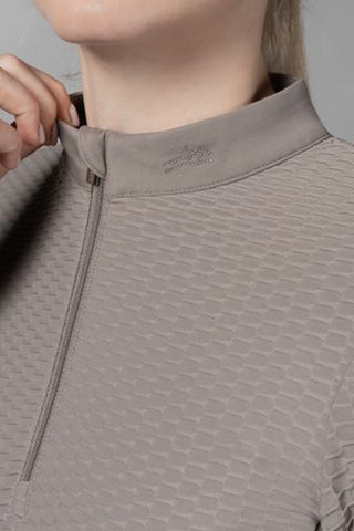 The shirt features long sleeves and a sleek stand-up collar that completes the timeless design. As a subtle yet luxurious detail, the collar is adorned with Schockemöhle's horse logo in sparkling rhinestones – perfect for those who appreciate discreet elegance, even during training.