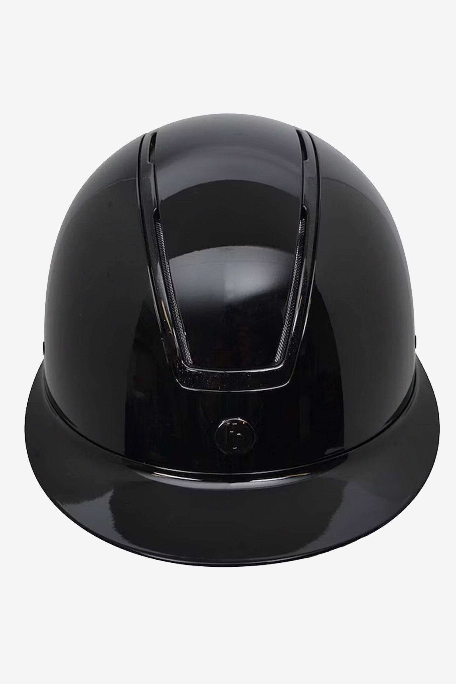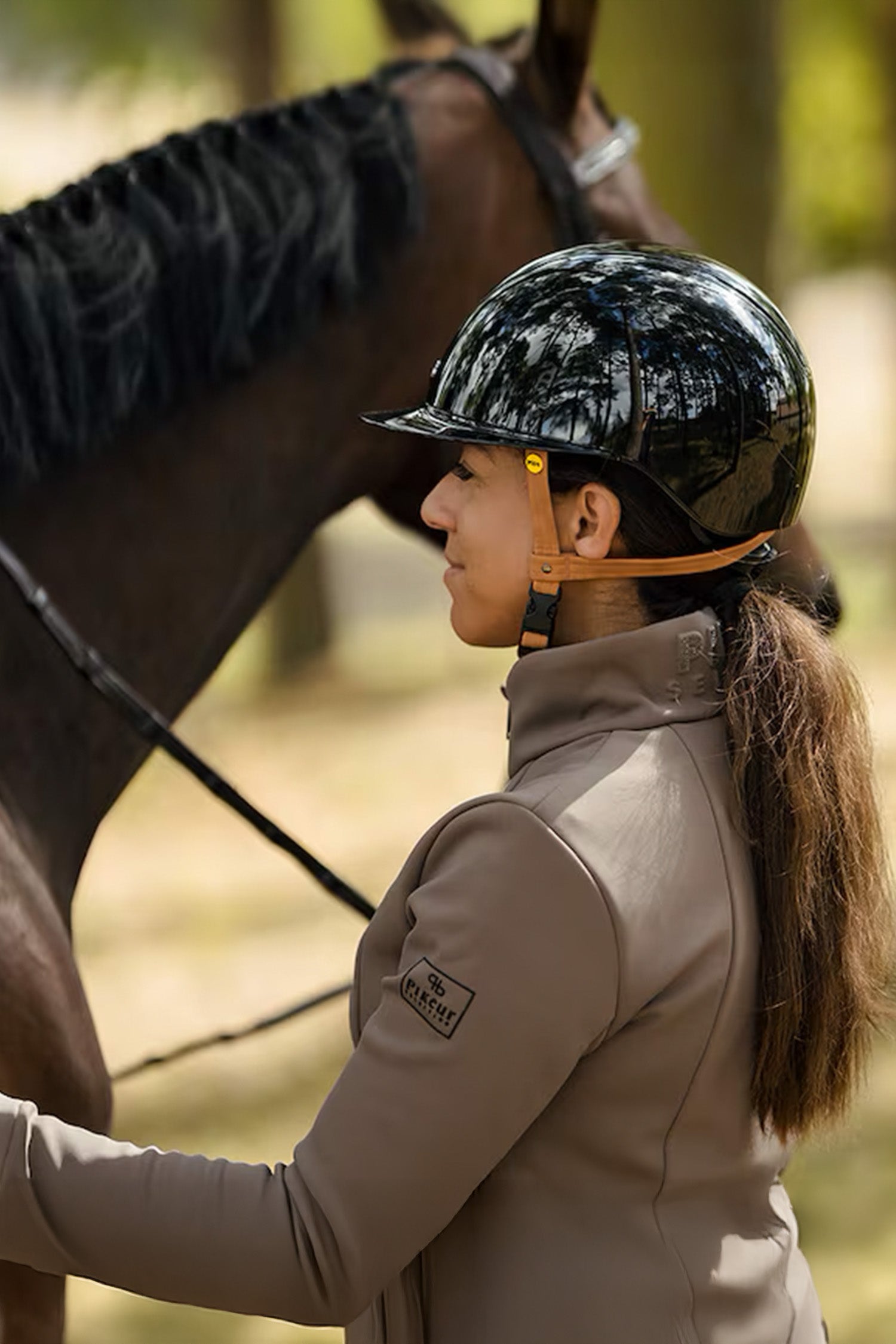 Experience the combination of safety, comfort, and exclusive design with this elegant riding helmet featuring MIPS technology. The helmet is made from premium polycarbonate and equipped with the integrated MIPS system, which provides extra protection against rotational forces in the event of a fall. Elegant shiny helmet with a wide sun visor and slightly sparkling material by the chrome details.