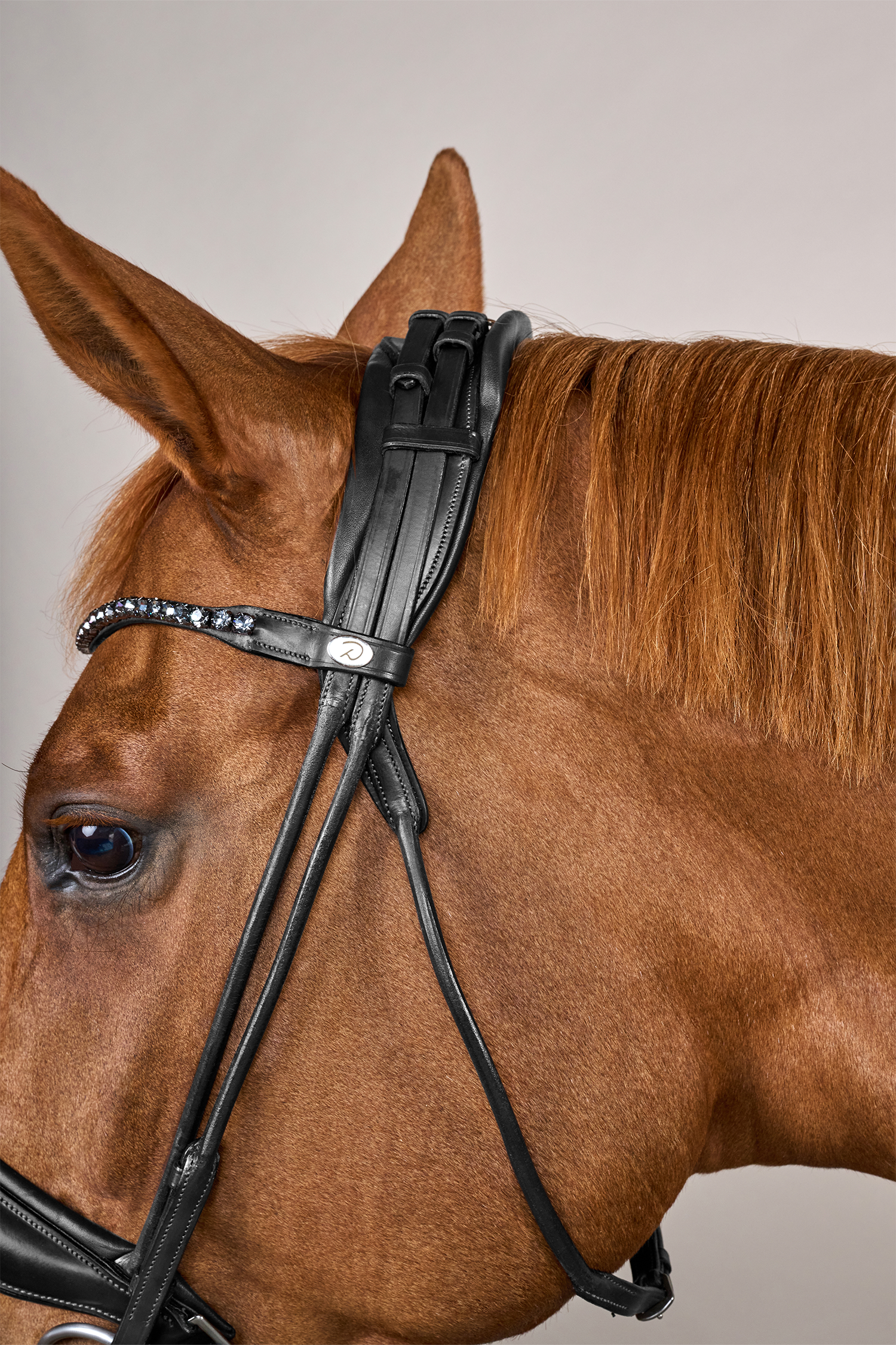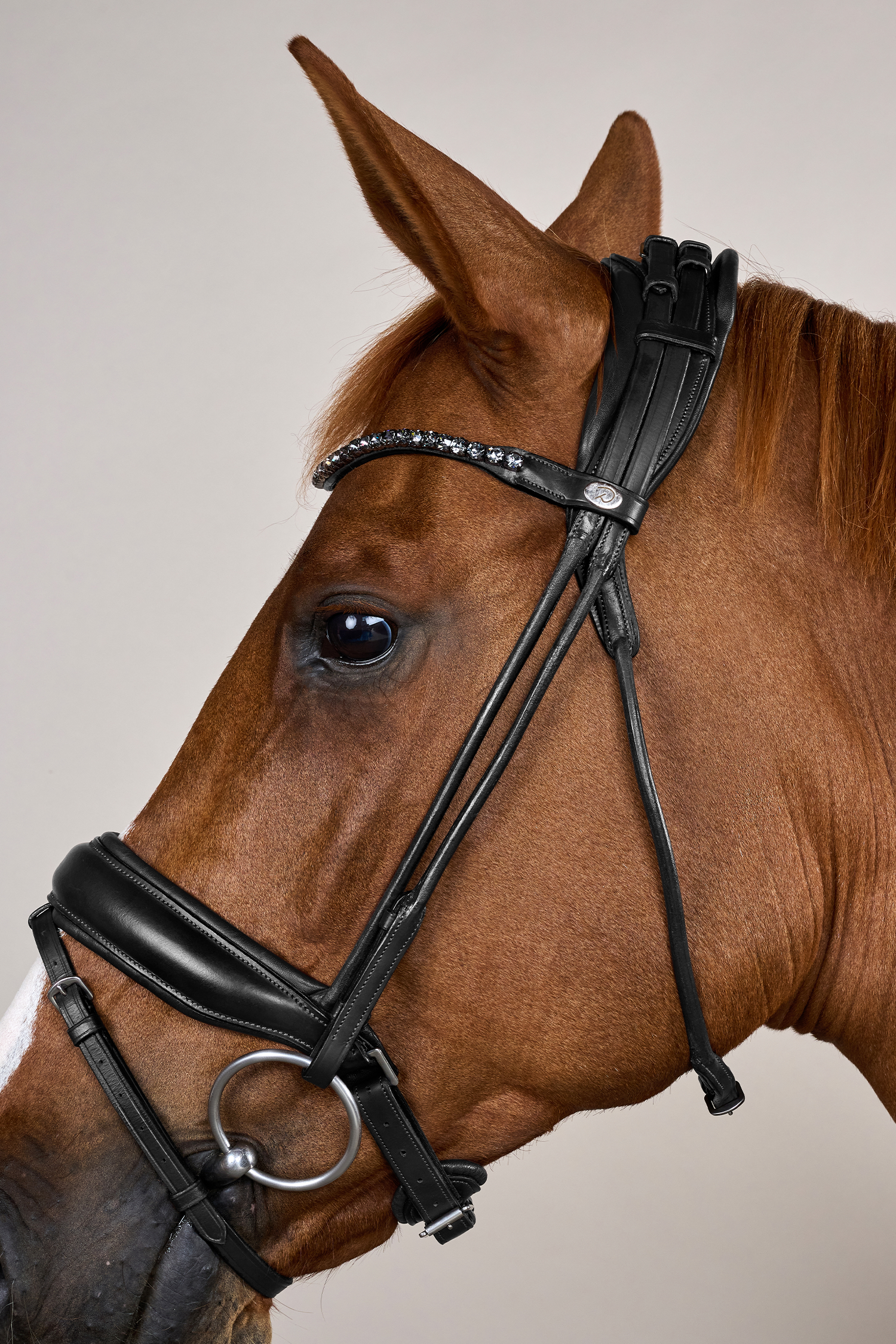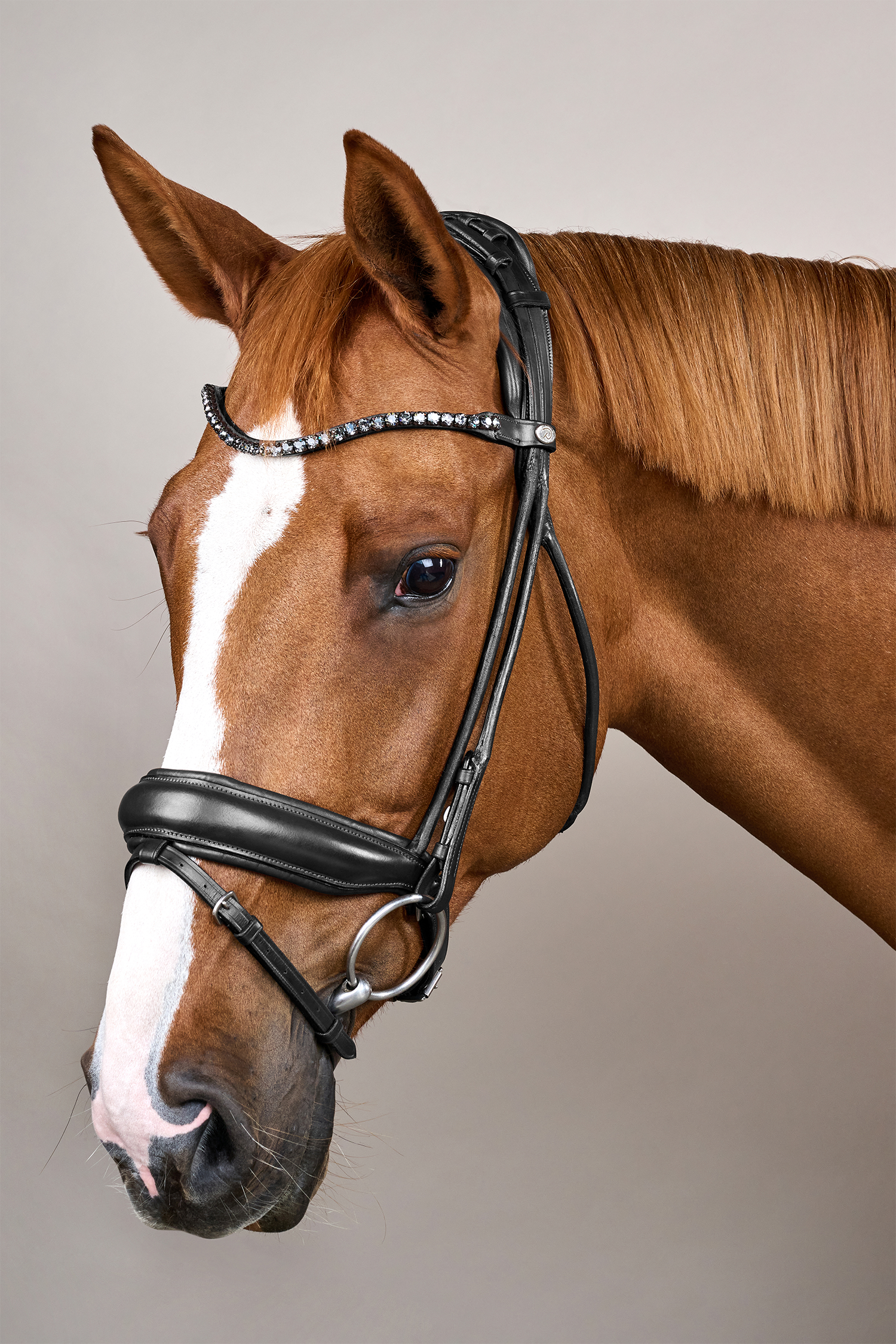 The bridle features a wide, softly padded noseband that provides even pressure distribution and stability without causing discomfort. The round stitched leather gives an elegant and traditional dressage look, while the V-shaped browband with fine grey Swarovski crystals adds a subtle yet luxurious detail that highlights the horse's expression.