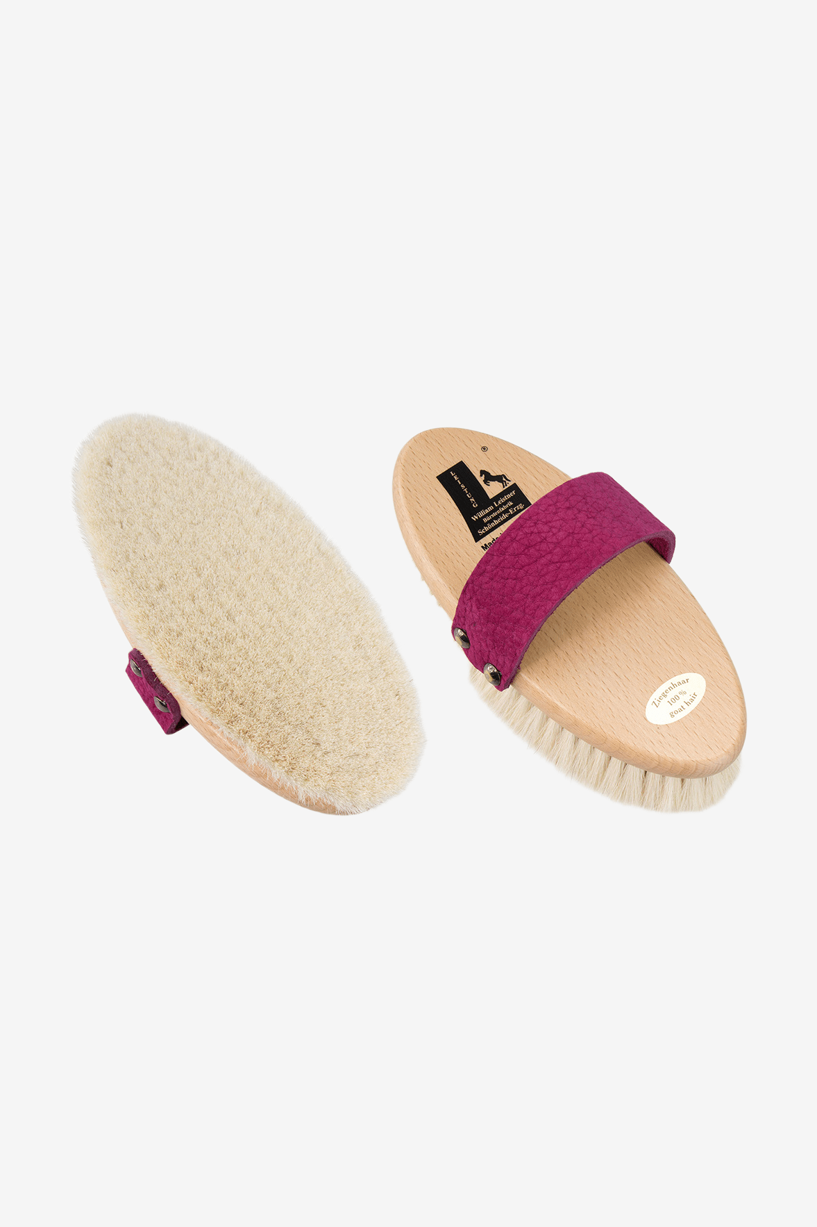 Made entirely of goat hair of the highest quality with a hardness that is extra-soft. Goat hair is very good for achieving the perfect finish and gives the coat a beautiful shine. The soft goat hair leaves no dust on the horse's coat and is superior in its shine effect. It also provides a very cozy and cuddly feeling. Made entirely of natural materials that do not generate any electrostatic charge. The length of the goat hair is 2.7 cm. The brush is made of lacquered beech wood and is also treated for an antibacterial effect. It has a very good fit and provides a comfortable feeling when you hold it in your hand. The strap over the back of the hand is made of premium leather that is comfortable against the hand, and it can also be shortened in length if needed.
