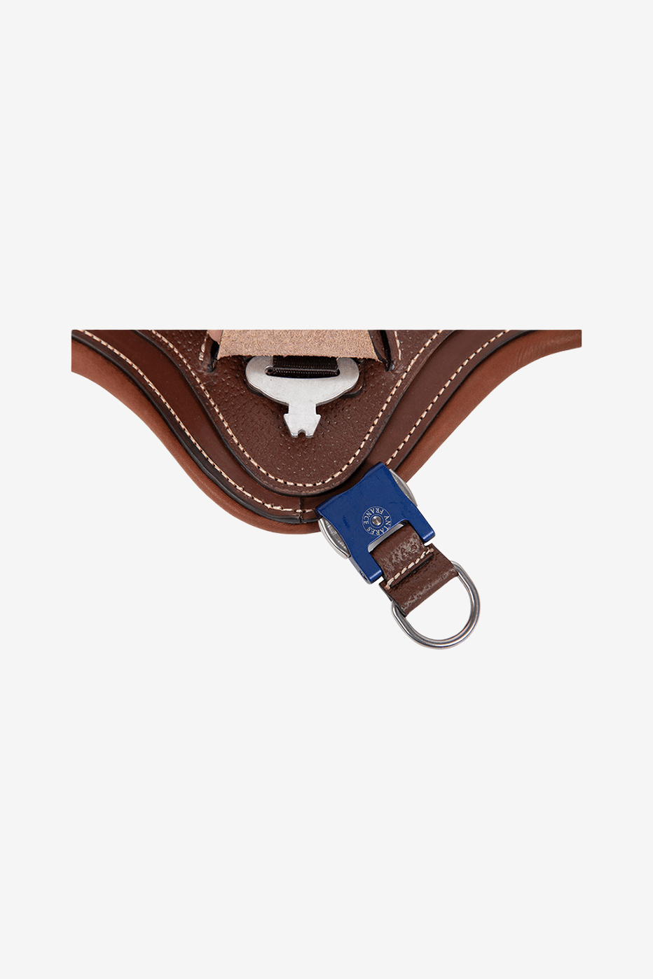 The girth plate is made of leather with cream decorative stitching. The martingale attachment is leather-covered to reduce the risk of the horse getting caught.