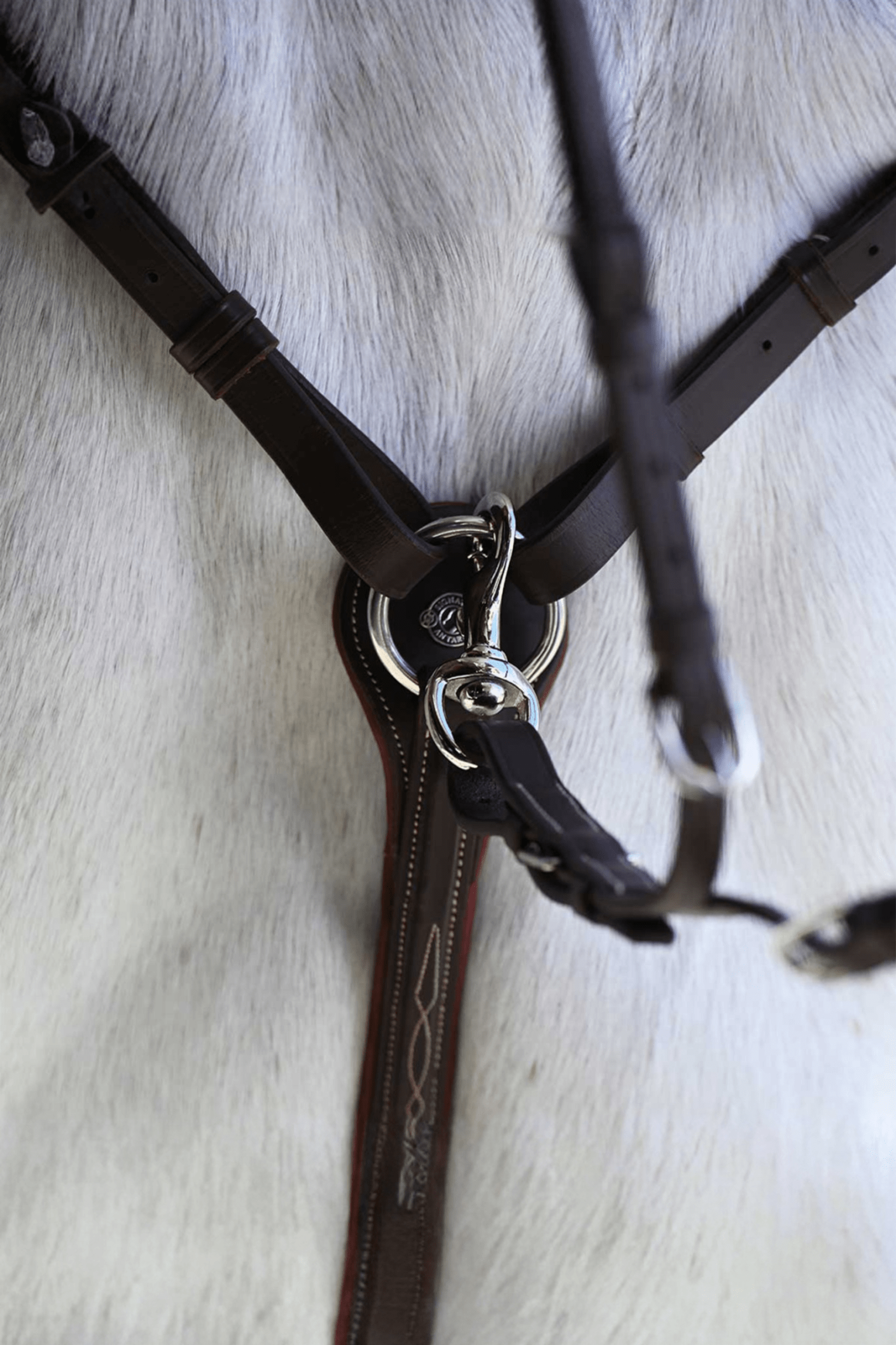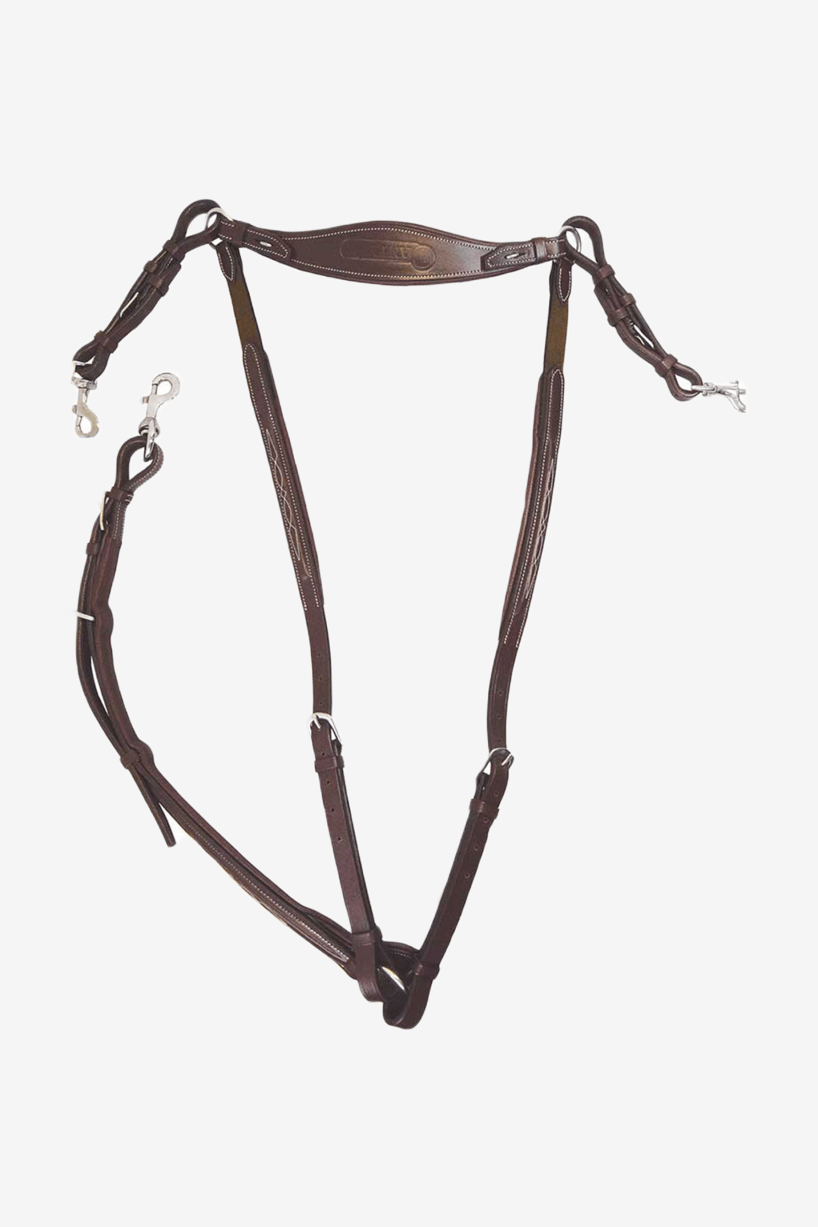 A classic breastplate in high-quality leather from the Signature by Antarès series. Clever stainless steel buckles for attaching to the saddle's D-rings and a removable bridge over the withers for increased stability. The leather along the horse's shoulder features stylish embroidery and brown elastic for greater flexibility. Attachment for martingale part at the front. NOTE: Sold without martingale part, this is purchased separately.