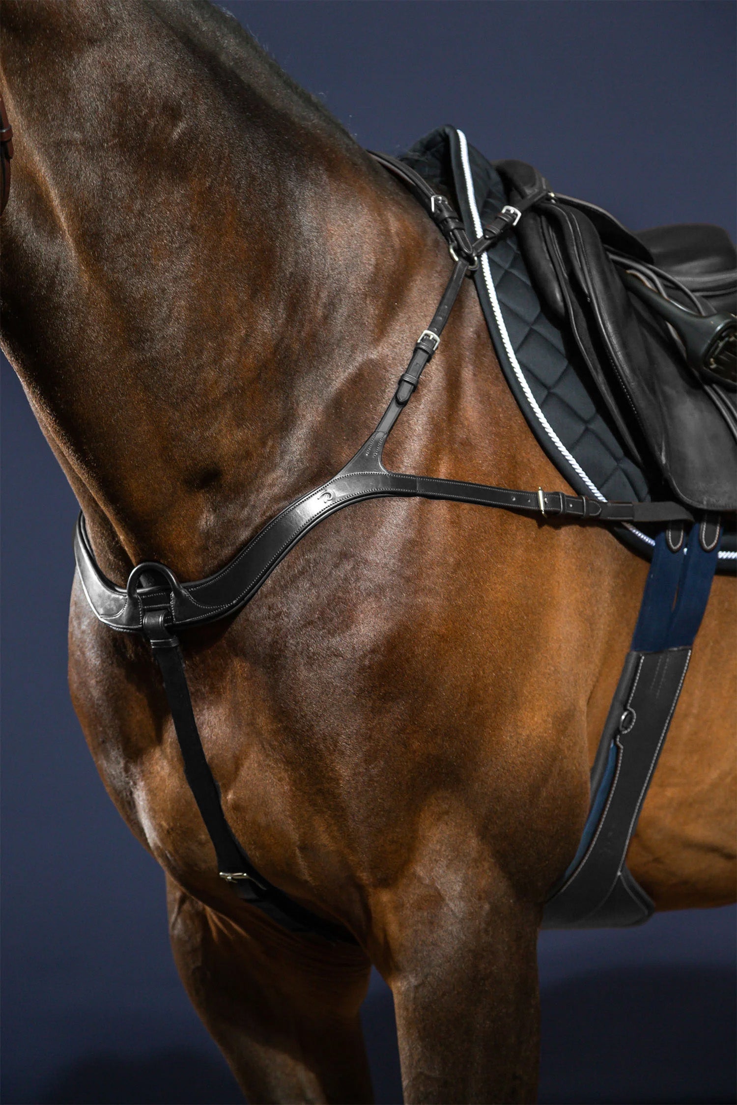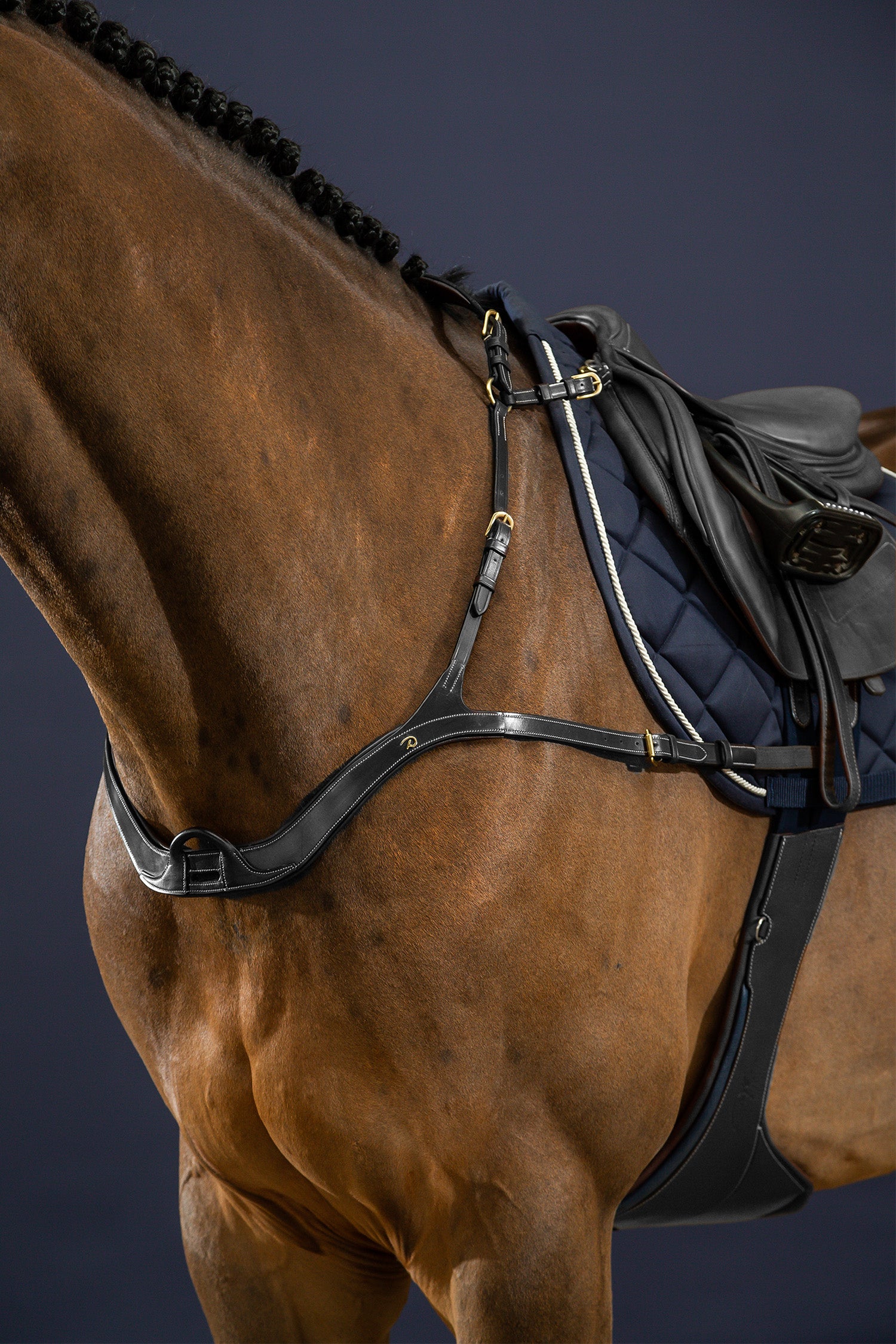 Very nice 5-point breastplate with perfect fit. Made of fine Spanish leather with silver buckles and tone-on-tone decorative stitching. Anatomically shaped to give the horse unrestricted freedom of movement. Attachment for short martingale is available and the strap between the horse's front legs is removable.