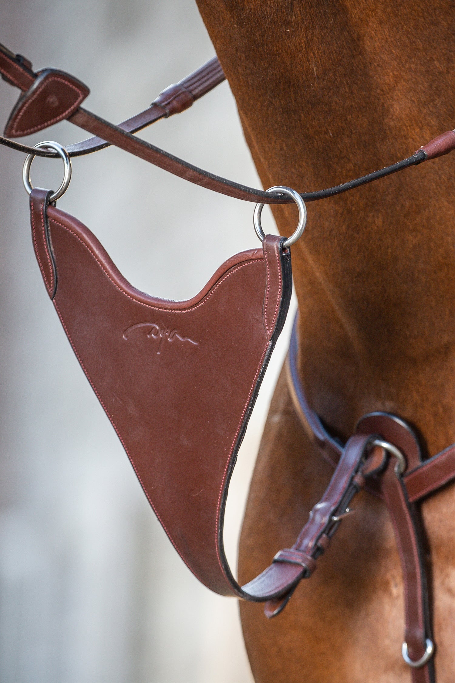 Dy'on Hard Bib Martingale Attachment from the New English Collection is an adjustable bib martingale made from exclusive, stiff Dy'on leather. It is designed to provide the horse with stability and guidance, while giving the rider extra control during riding. The martingale is easily attached to a breastplate or yoke with the help of a roller buckle.