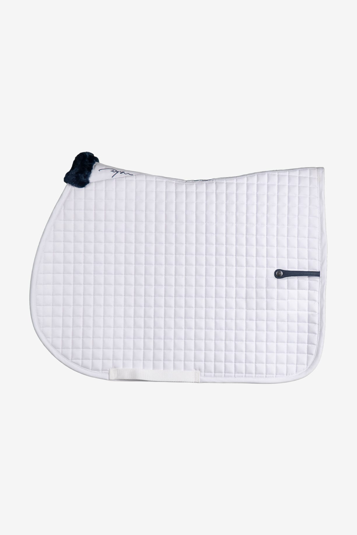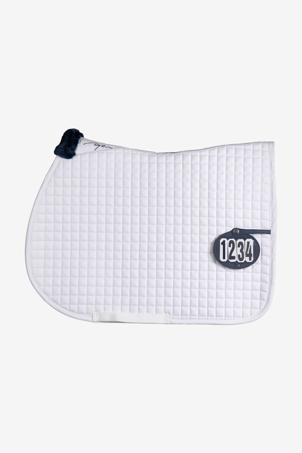 Show jumping saddle pad from Dyón Classic small checkered jumping saddle pad with a smart leather flap with a snap button for easy attachment of a number plate.