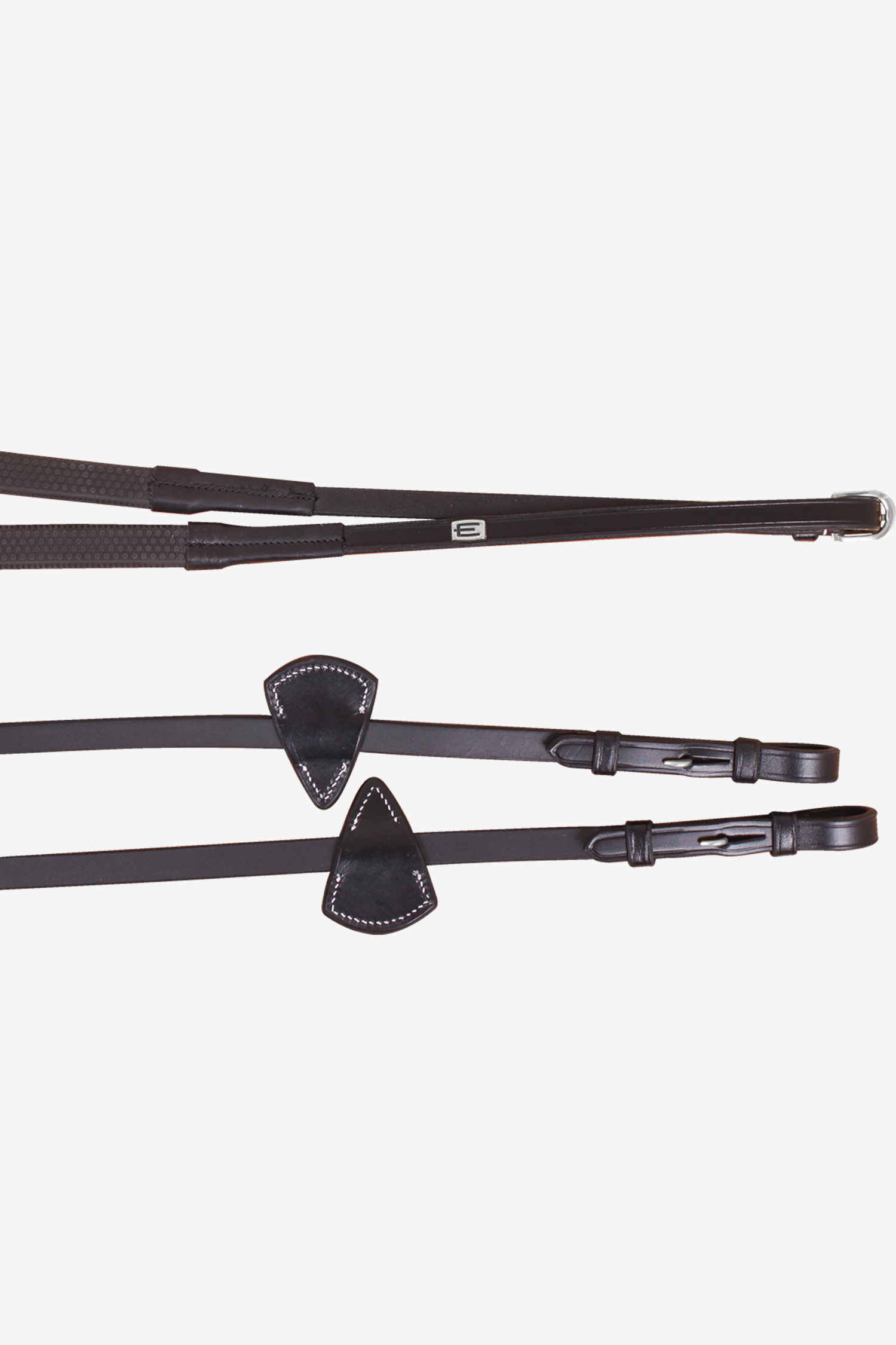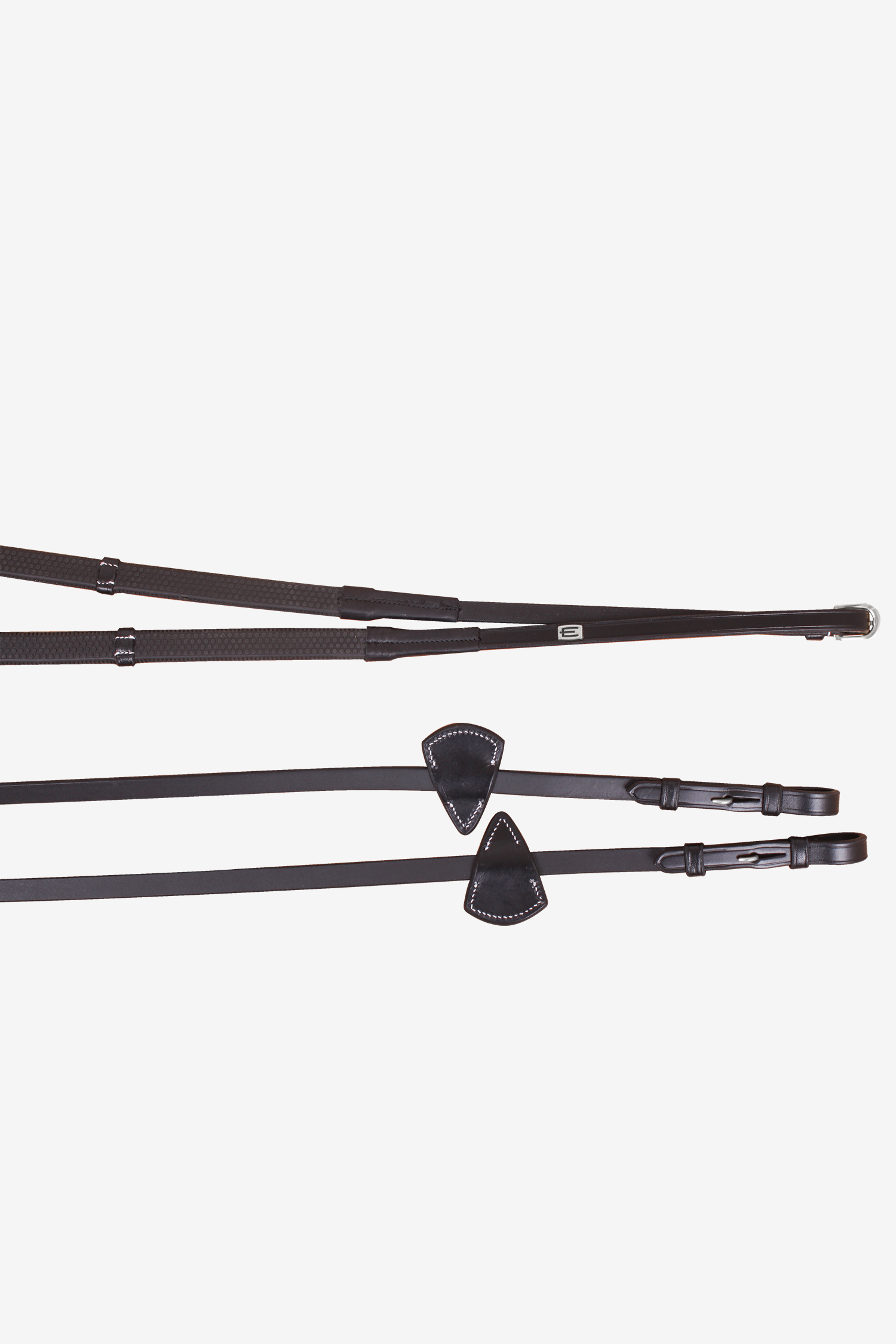 Rubber reins with exclusive Italian leather, stops, and white stitching. Martingale stops with white stitching and silver buckles. Luxurious E-logo as the finishing touch.