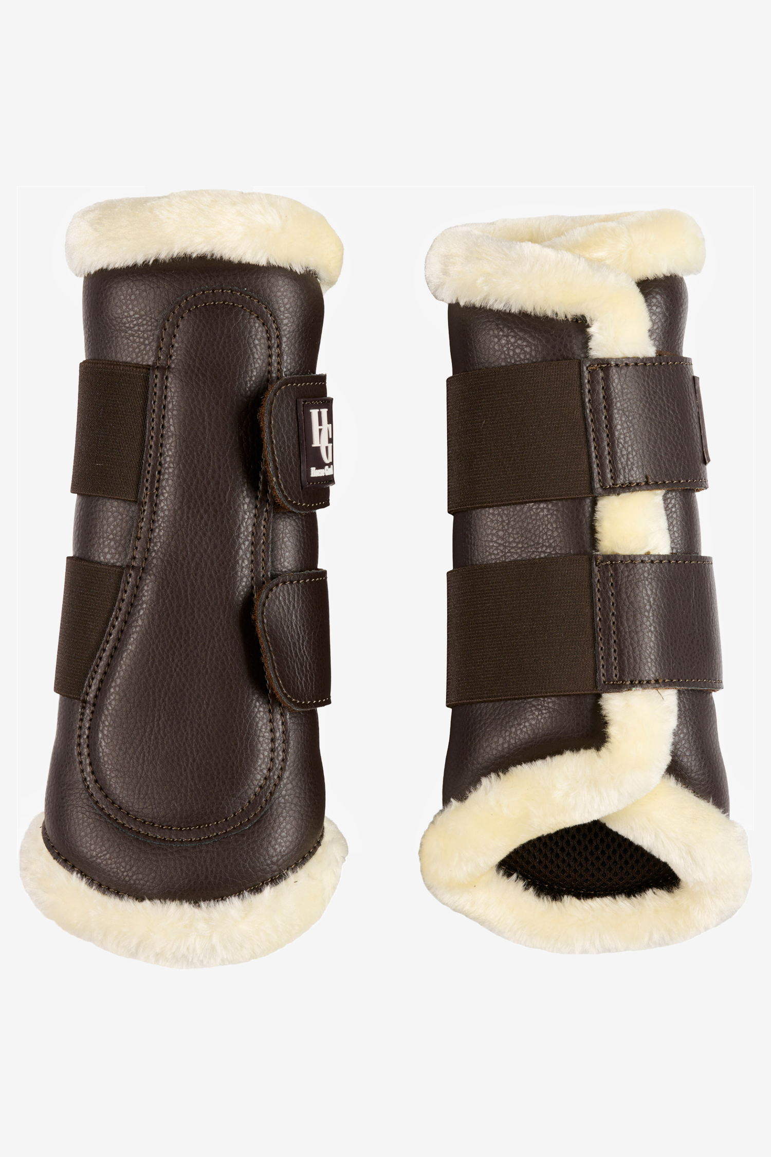 Dressage boots made of artificial leather with a flexible outer shell. Lined with mesh lining and faux fur trim to prevent irritation and chafing.