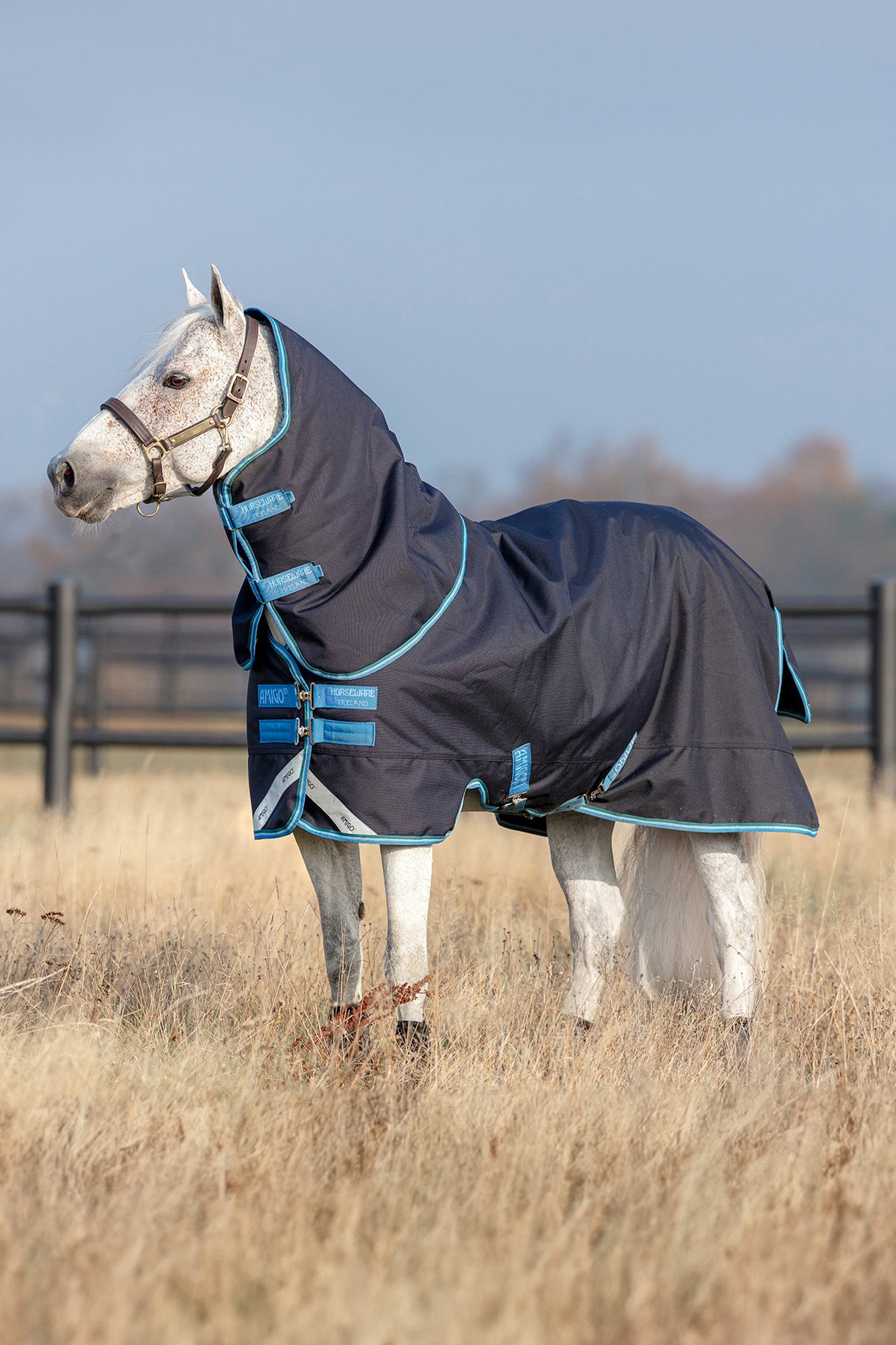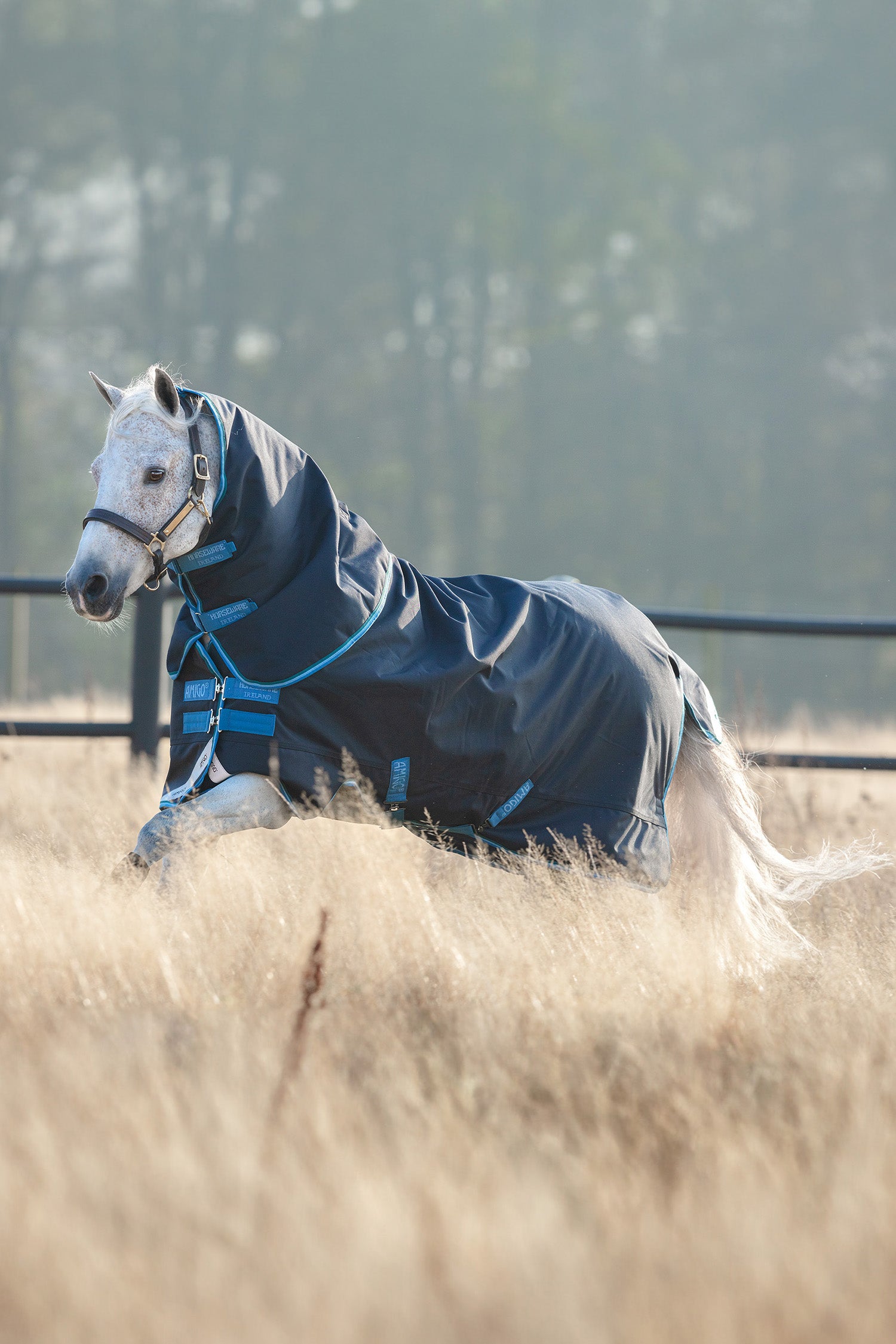 This blanket is an outdoor blanket for ponies with a filling of 250g. The blanket has a durable outer material in 1200D and is manufactured by Horseware. It features a super tough, breathable, and waterproof outer material made of polyester. The blanket is cut at the legs for maximum leg movement freedom and has an inner material of polyester to minimize chafing. It has a front closure with a T-buckle and 2 cross surcingles under the belly, as well as metal buckles on the inside of the neck to attach a neck cover. The blanket comes with a detachable neck cover (150g).