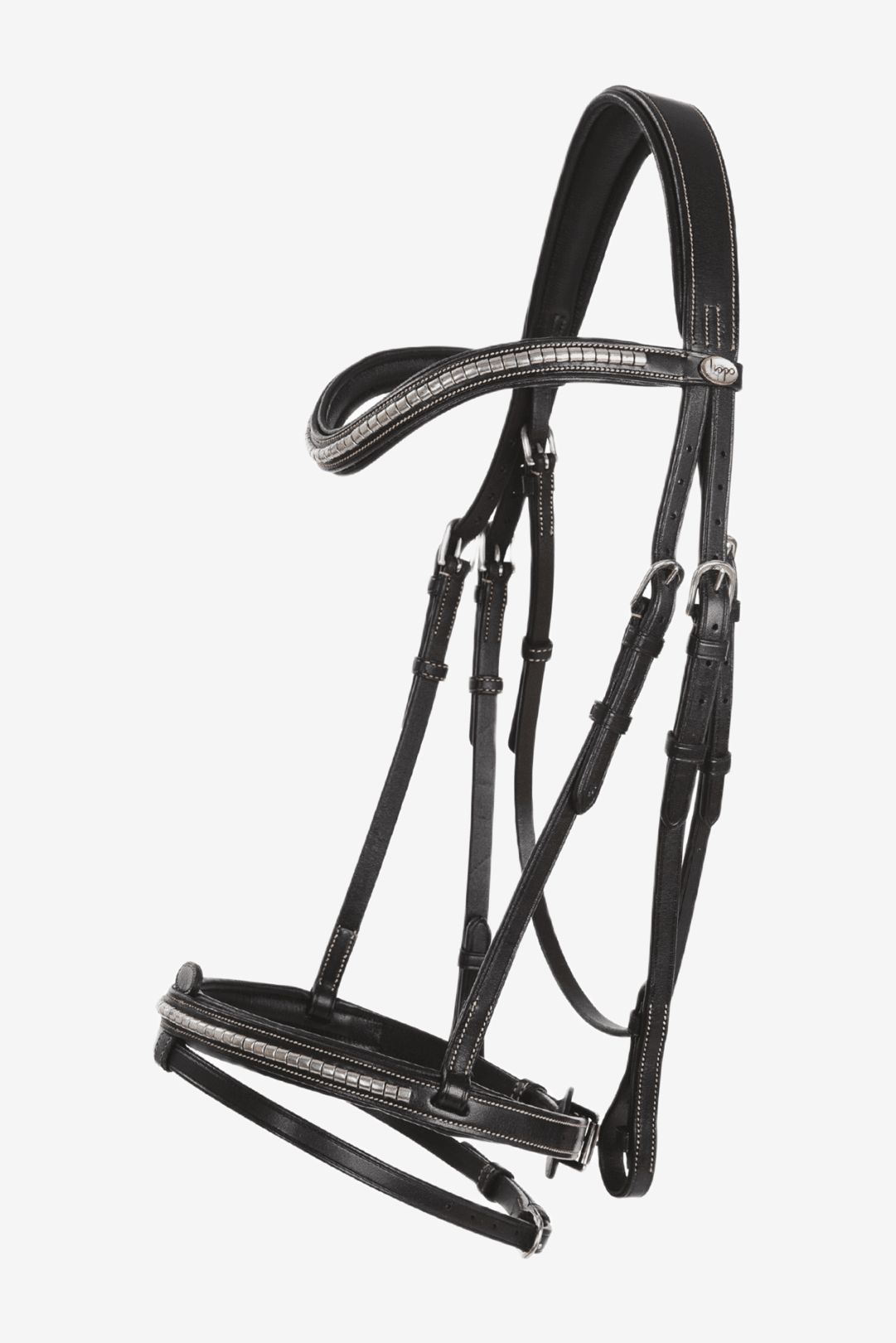 Bridle Lippo Supreme Nexon Aachentrense with combined noseband in soft leather of American quality. Anatomically shaped headpiece. Decorated with studs on both the browband and noseband, which are also softly padded. The studs are in genuine silver. The bridle is equipped with a removable nose strap, as well as the attachment on the noseband to the nose.