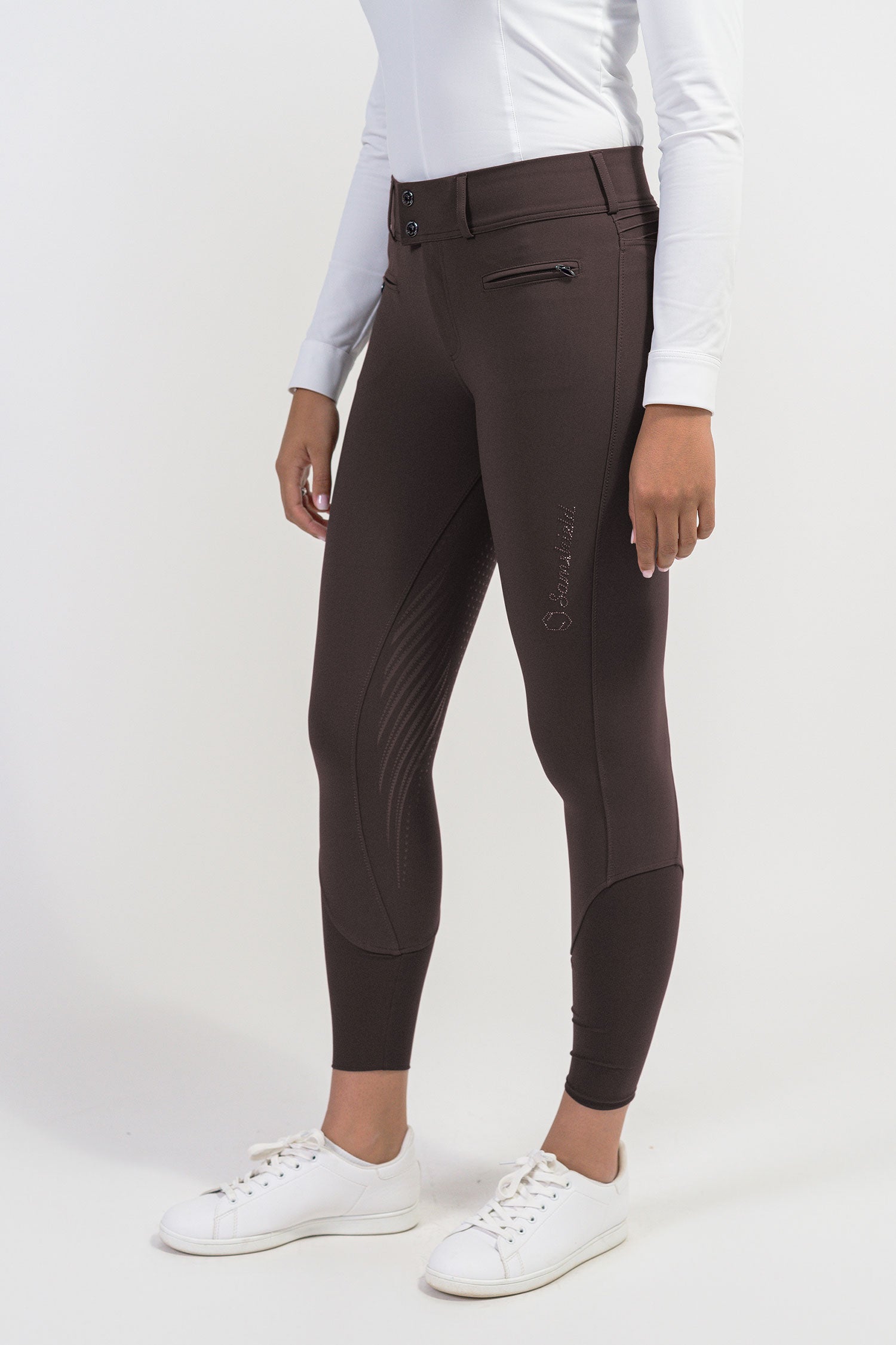 The Clara riding breeches are an elegant, stylish, and modern choice for riders looking for high-waisted pants. The breeches are made from four-way stretch Italian material that provides a second-skin comfortable feel for the rider with exceptional freedom of movement. Full-seat model with silicone in a stylish pattern provides a firm grip in the saddle. The breeches also have silicone on the inside of the waistband to help keep the shirt in place. All to allow you to focus optimally on riding without having to think about the clothes.