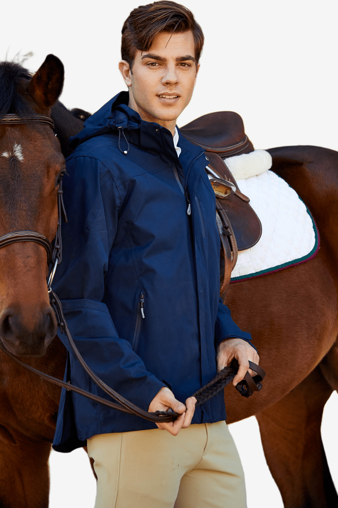 Veste élégante et sportive en matériau imperméable qui reste respirant sans procurer de sensation d’étouffement. Coutures étanches et fermeture éclair imperméable pour vous garder au sec lorsque la météo fait défaut. Capuche amovible avec cordons de serrage réglables. Deux fentes latérales zippées à l’arrière pour faciliter l’équitation. Poches latérales zippées et une poche poitrine zippée. Une poche supplémentaire se trouve à l’intérieur. Poignets réglables avec fermeture velcro.