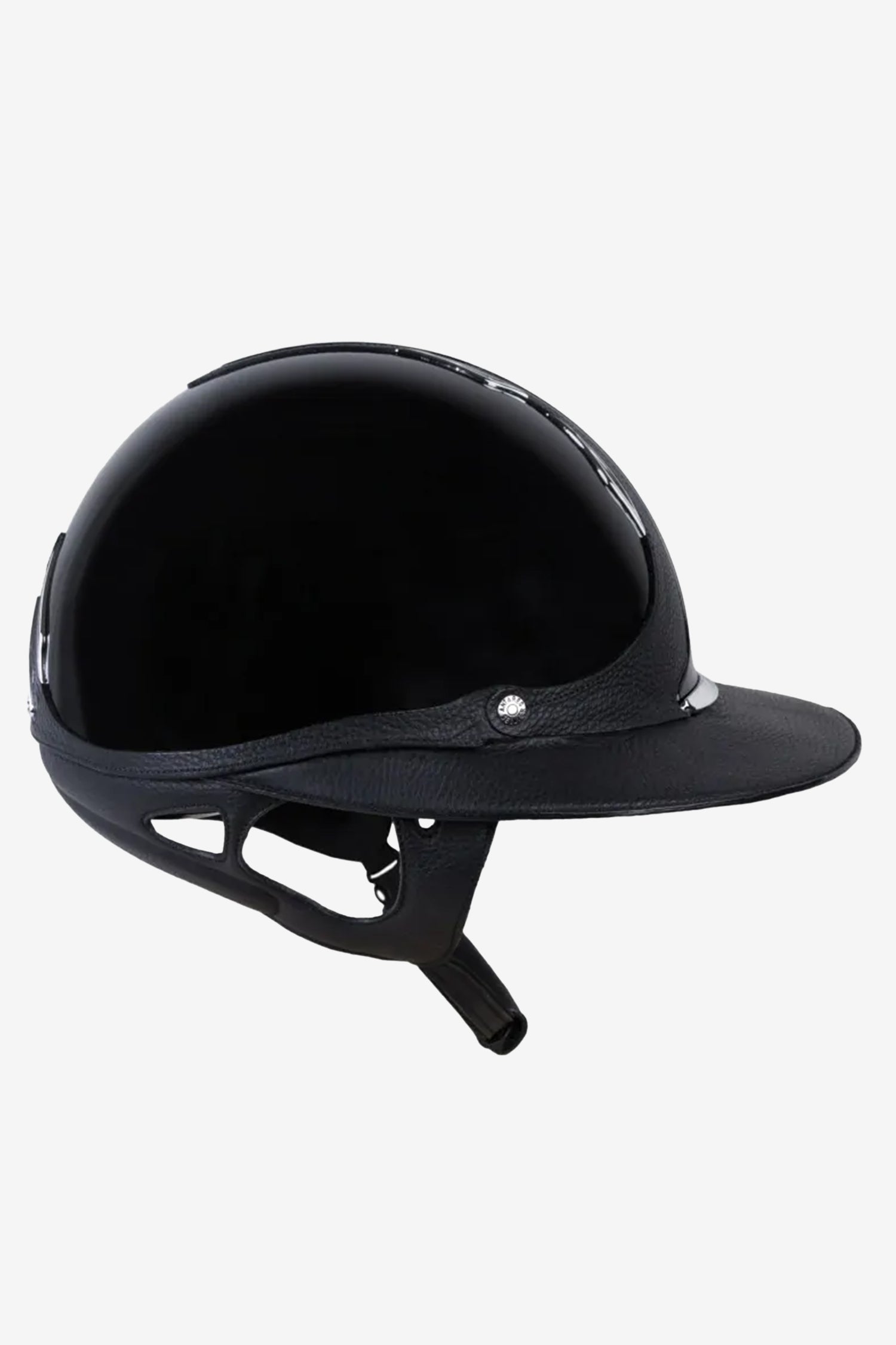 Un casque d'équitation avec une finition brillante et des détails en chrome.