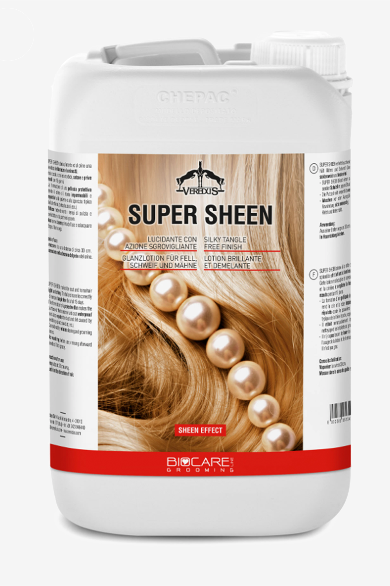 Super Sheen rend la crinière et la queue douces, soyeuses et totalement sans nœuds jusqu'à 15 jours. Le poil obtient une brillance éclatante et une couche protectrice qui le rend hydrofuge et protège contre la poussière et la saleté de l'écurie et du paddock. Le temps de pansage et de nettoyage est ainsi considérablement réduit.