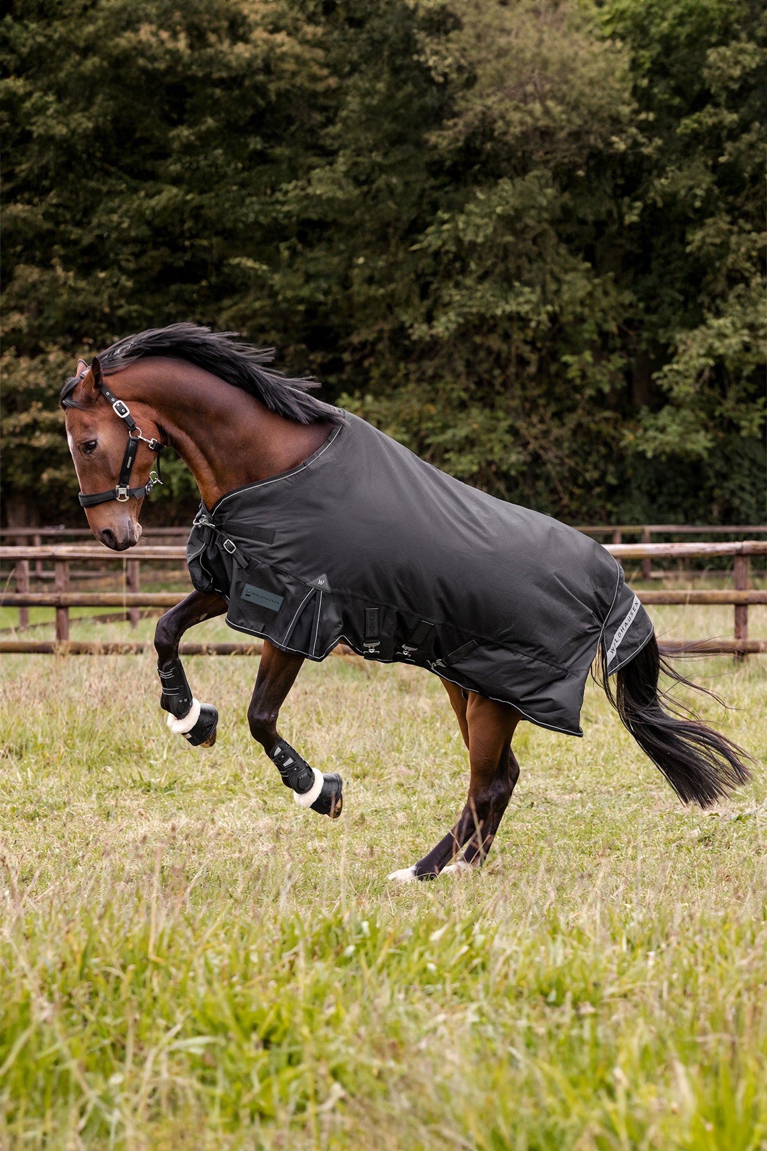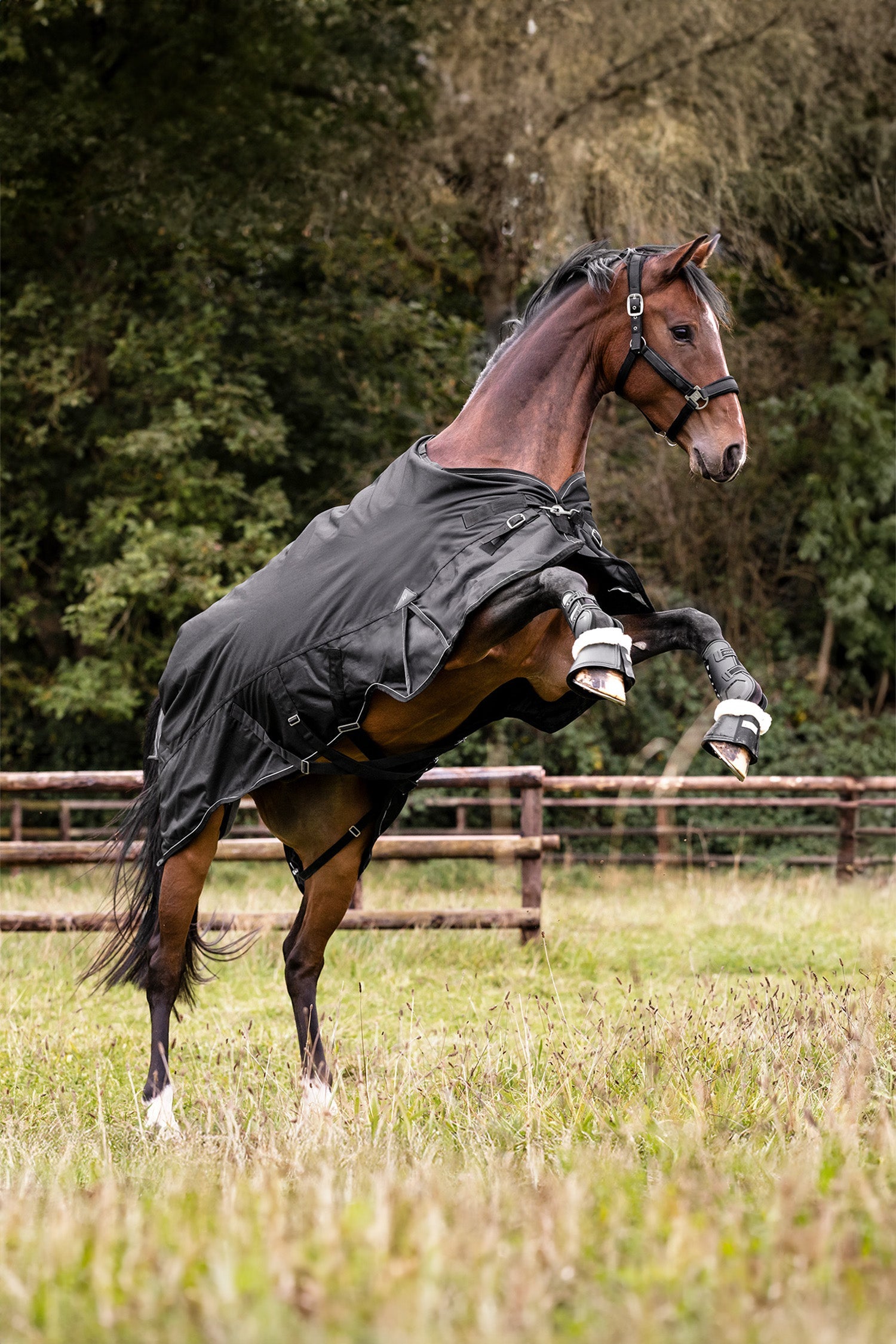 La couverture possède un garnissage de 200 g qui offre juste la bonne chaleur lors des journées fraîches, tandis que la doublure antibactérienne assure une sensation de fraîcheur et de confort pour votre cheval. Grâce à la nouvelle fermeture en V à l'avant avec velcro supplémentaire, ainsi qu'au design kick pleat, le cheval bénéficie d'une liberté de mouvement optimale et d'un ajustement stable.