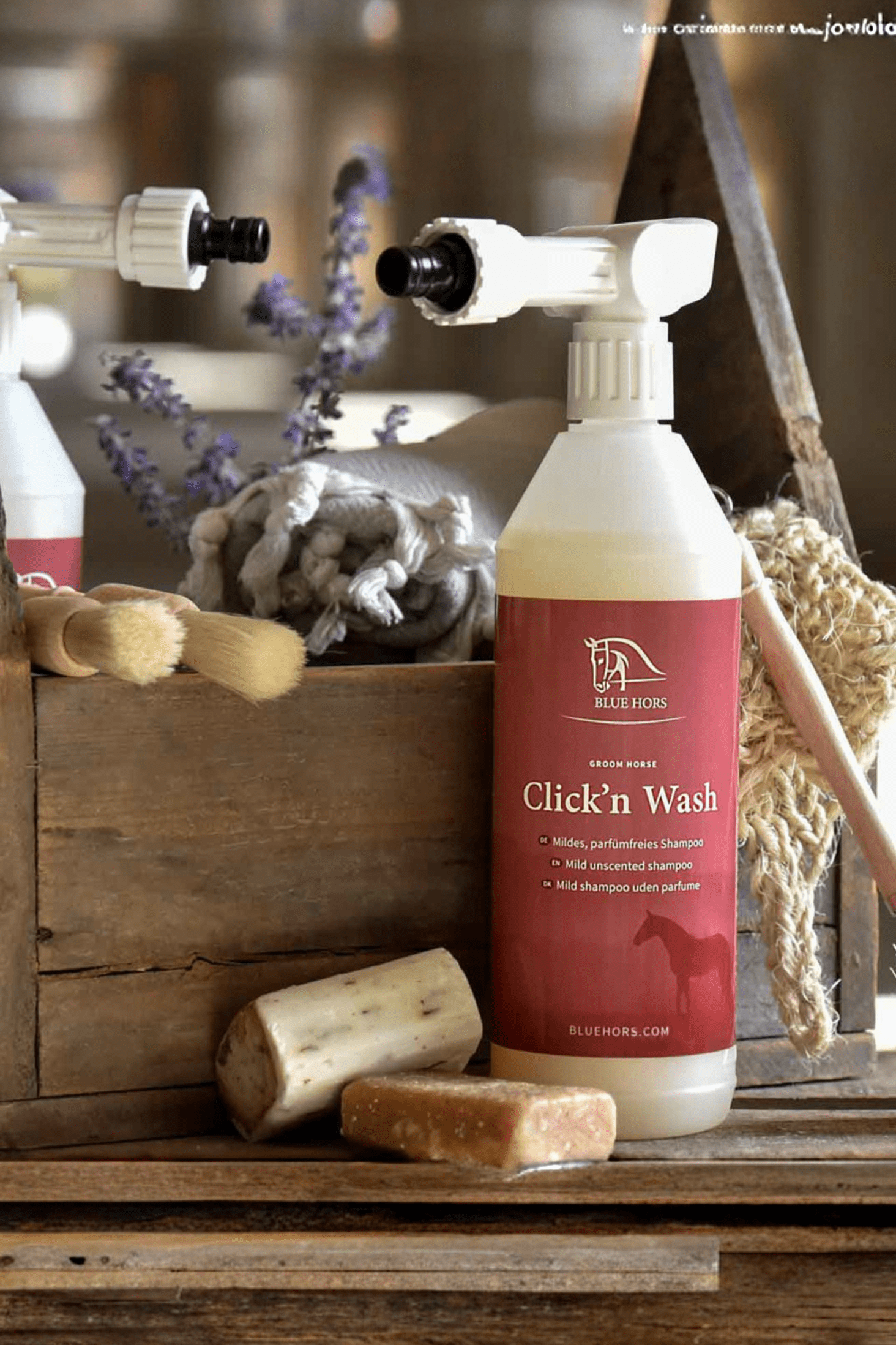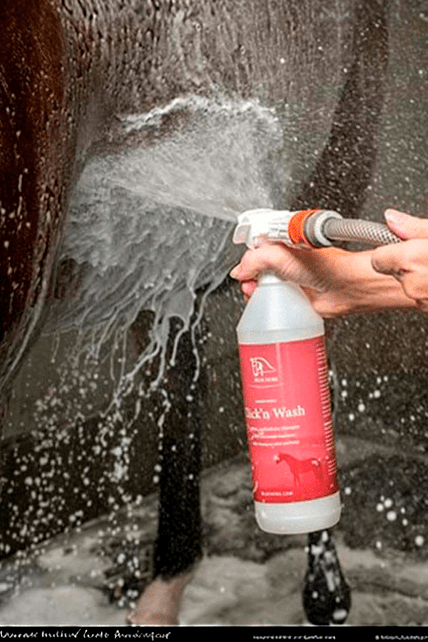 • Zonder mondstuk: Spoel het paard af met lauwwarm water, masseer de shampoo in de vacht en spoel daarna uit.