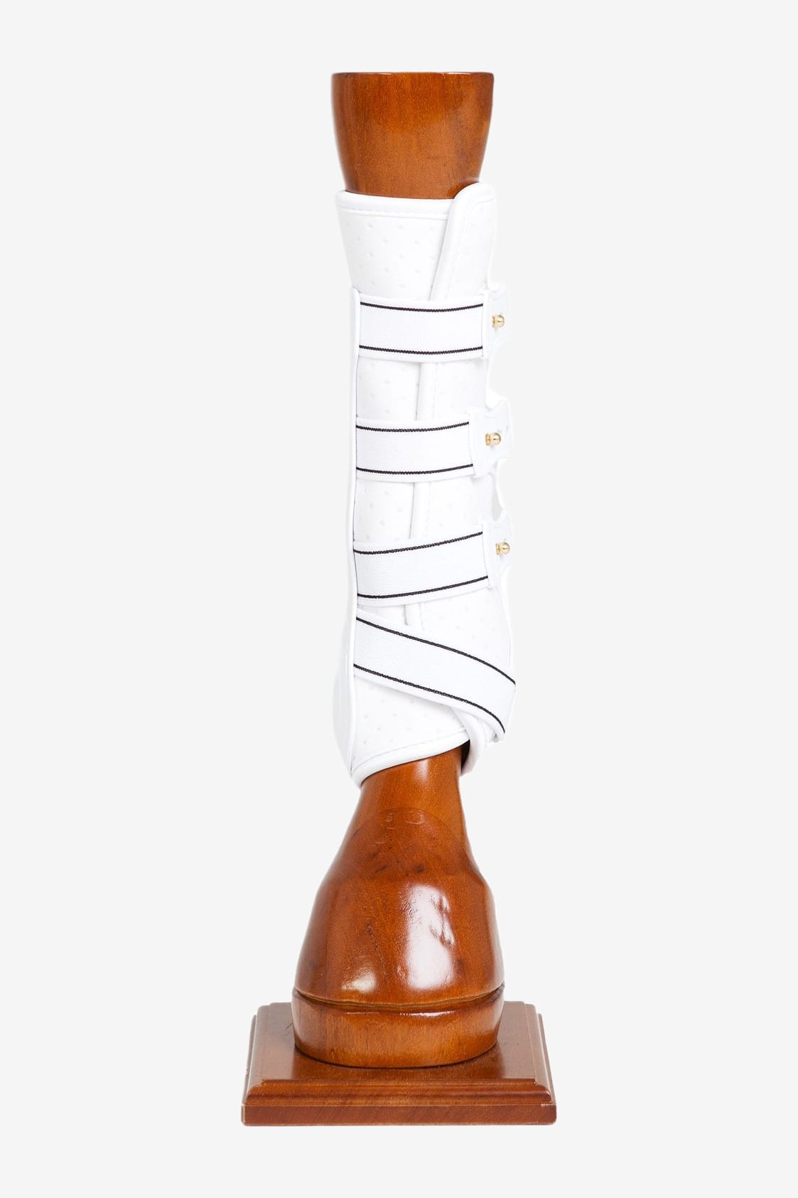 De gamacher hebben een duurzame buitenlaag en een vulling van zacht schuim die helpt de kracht van harde schokken en stoten te verminderen. De binnenzijde is geperforeerd voor extra luchtcirculatie. De gamacher worden vastgemaakt met sterke elastische sluitingen en messing knopen, evenals een extra versteviging aan de onderkant. Klassiek zwart met witte details op de sluitingen.