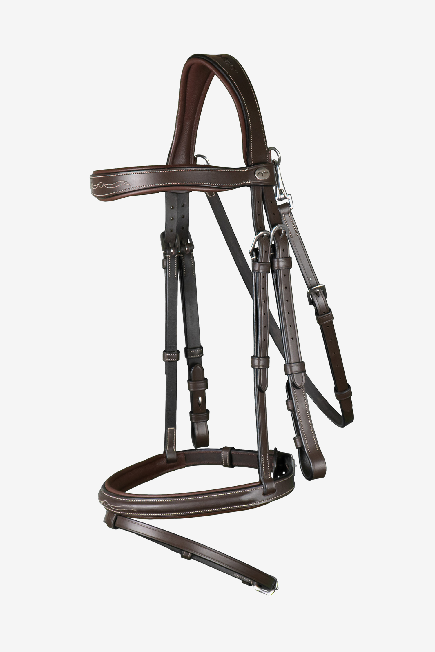De decoratieve stiksels geven een verfijnde afwerking zonder concessies te doen aan de functionaliteit. Met het anatomische kopstuk wordt de druk gelijkmatig verdeeld, wat het paard meer comfort en ontspanning tijdens het rijden biedt.