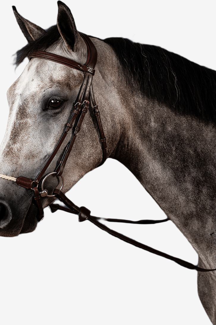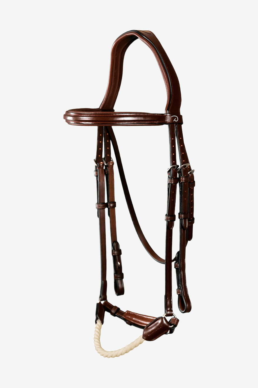 Hoofdstel van Dyón – New English Collectie. Anatomisch hoofdstel met Remont neusriem van touw. Het nieuwe hoofdstel van Dyón combineert comfort met stijl en is gemaakt van het fijnste leer. Het kopstuk is iets breder met een uitsparing voor de oren en is gevoerd met 2 mm neopreen. Het hoofdstel heeft drie riemen voor de neusriem, het bakstuk en de keelriem. Om druk te voorkomen die ontstaat door het over de nek halen van de neusriem, is de neusriem direct bevestigd aan de derde zijriem van het hoofdstel. Gespen: Zilver.