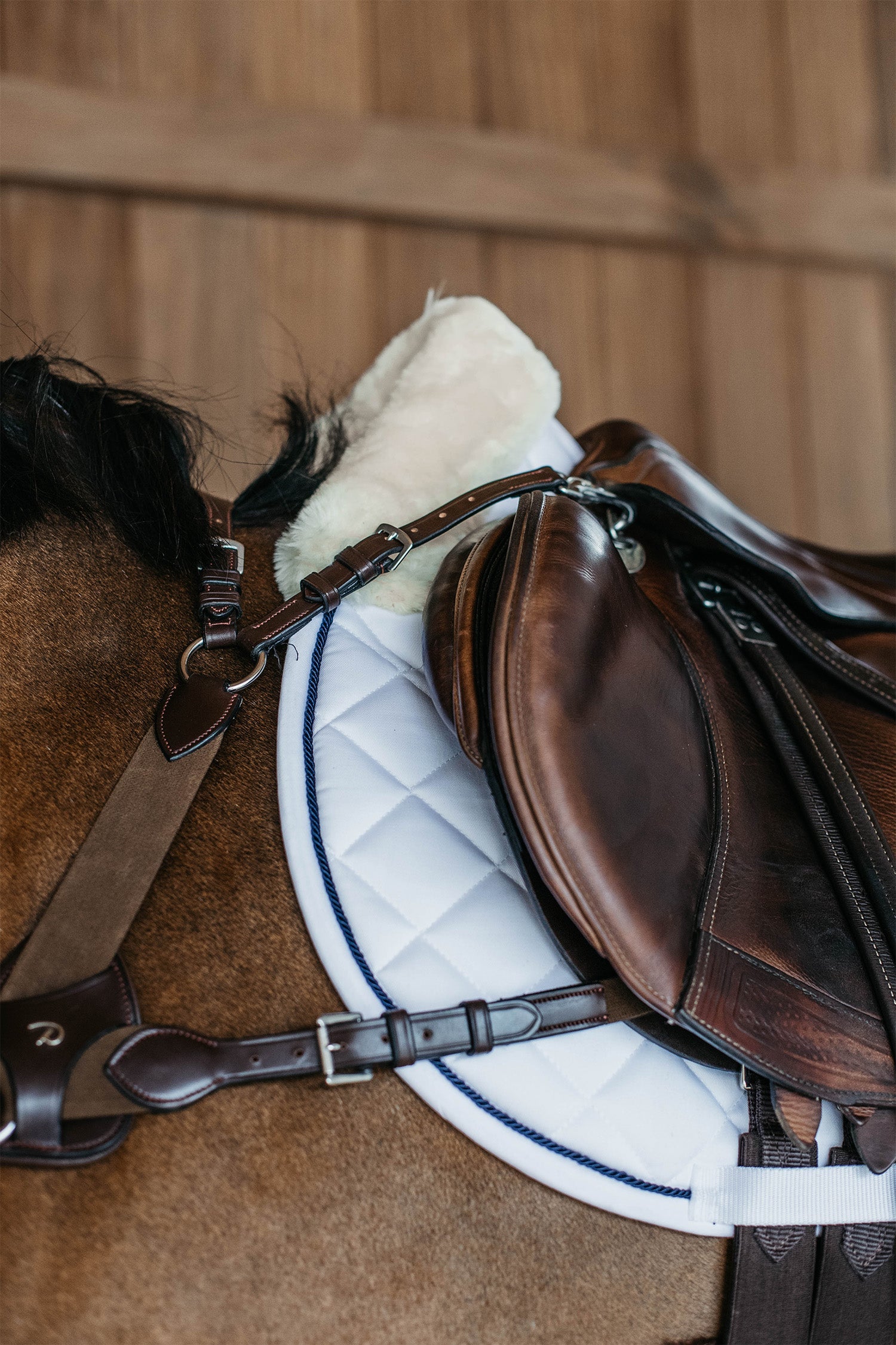 De Dy'on Skin Friendly Springonderlegger is ontwikkeld om maximaal comfort te bieden, vooral voor paarden met een gevoelige huid. De binnenzijde is gevoerd met veganistisch lamswol, ook bij de schoft, wat het risico op schuren en druk vermindert en tegelijkertijd een zachte en aangename sensatie tegen de paardenrug geeft.