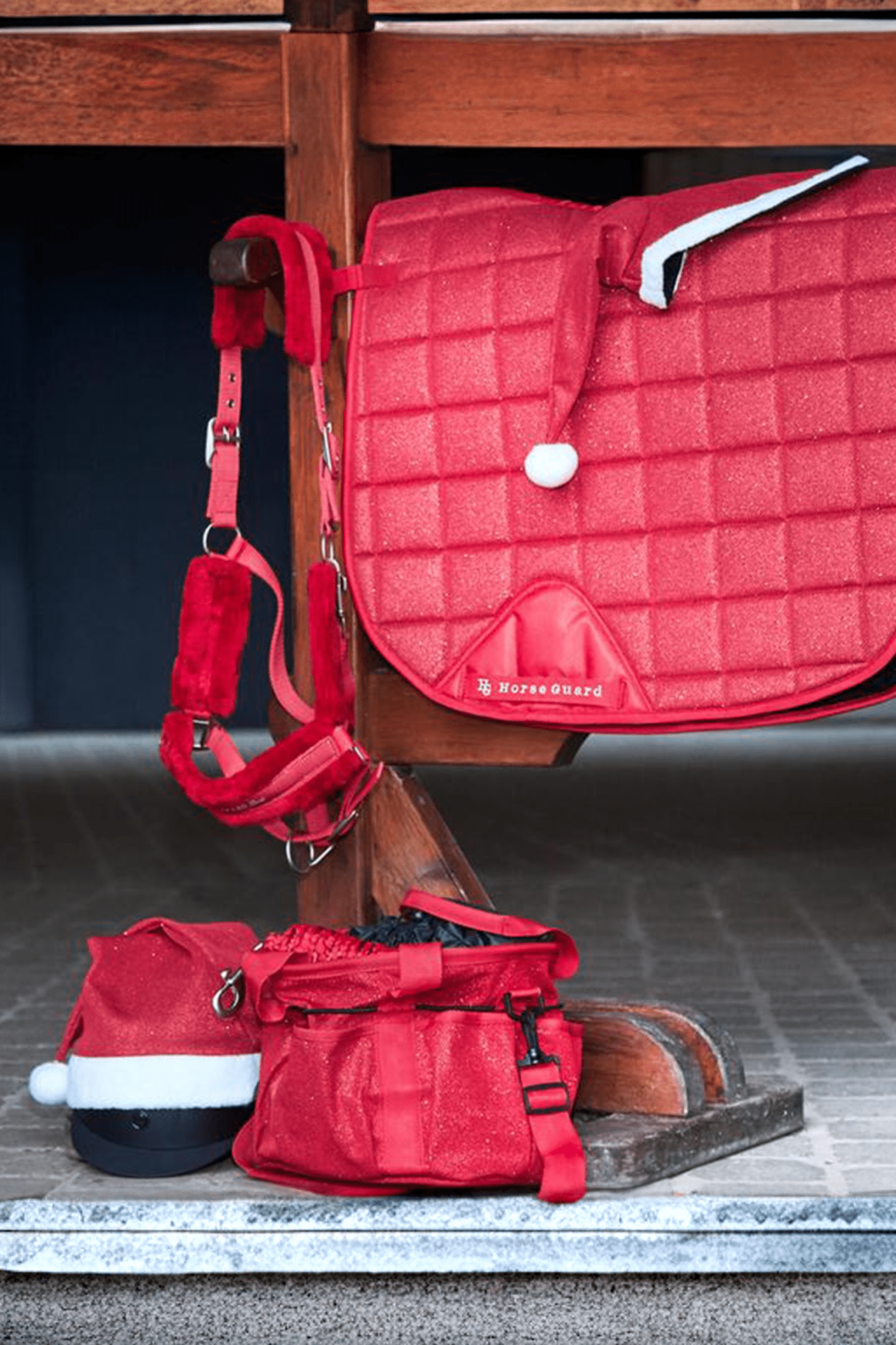Een fantastische muts voor het paard met een vleugje glitter, doordat de meshstof een glittereffect heeft. Borduursel met Merry Christmas aan de voorkant en een rand van witte imitatiebont. Openingen voor de oren.