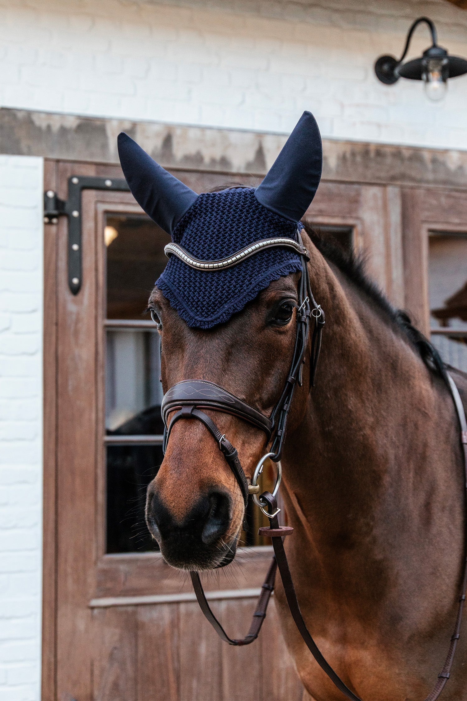 Kentucky Soundless Oornetje in navy combineert stijl en functionaliteit voor ruiters die hun paard zowel comfort als focus willen bieden. Het oornetje is met de hand gehaakt van hoogwaardig katoengaren en zorgt voor een duurzaam en ademend ontwerp. De speciale geluidsdempende oren van rekbaar materiaal verminderen storende geluiden, waardoor het paard zich beter kan concentreren tijdens training en wedstrijd.