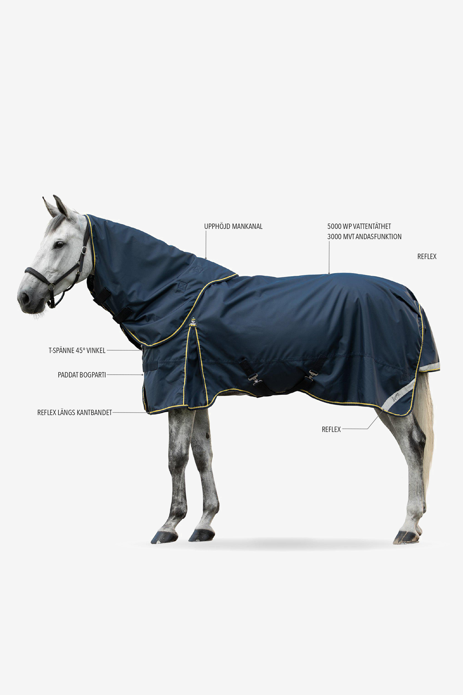 Het licht gevoerde schoudergedeelte vermindert het risico op schuren, terwijl de afneembare hals met verhoogd schoftkanaal de manen beschermt. Reflecterende banden langs de randen en achter op de staartflap verhogen de veiligheid in het donker, en de elastische, kunststof staartkoord is eenvoudig schoon te maken. De binnenzijde heeft een glanzende, ademende voering met warme polyester vulling die het paard in alle weersomstandigheden comfortabel houdt.