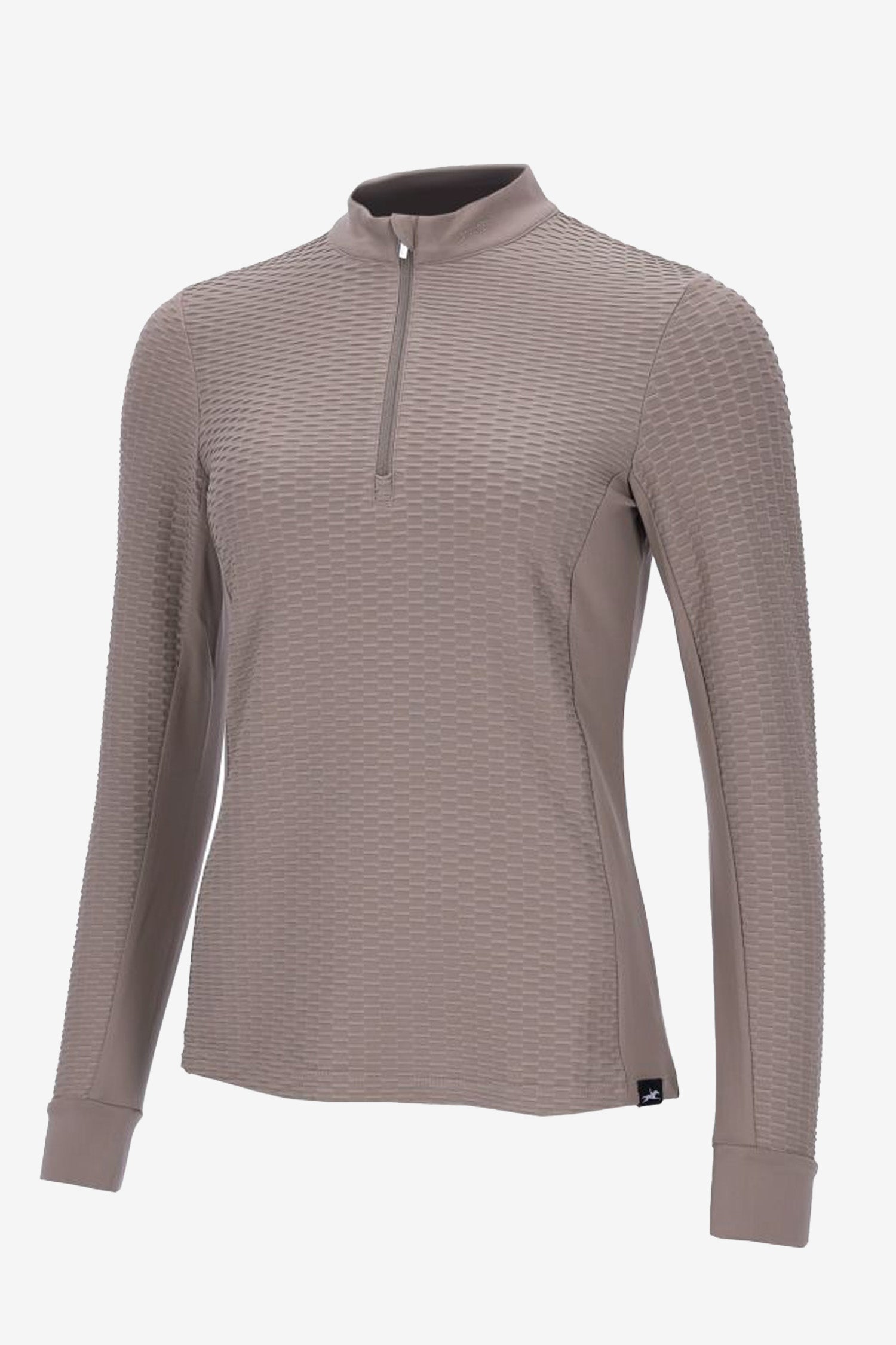 Het shirt heeft lange mouwen en een stijlvolle opstaande kraag die het tijdloze ontwerp compleet maakt. Als subtiel maar luxueus detail is de kraag versierd met het paardenlogo van Schockemöhle in fonkelende strass-steentjes – perfect voor wie houdt van discrete elegantie, ook tijdens de training.