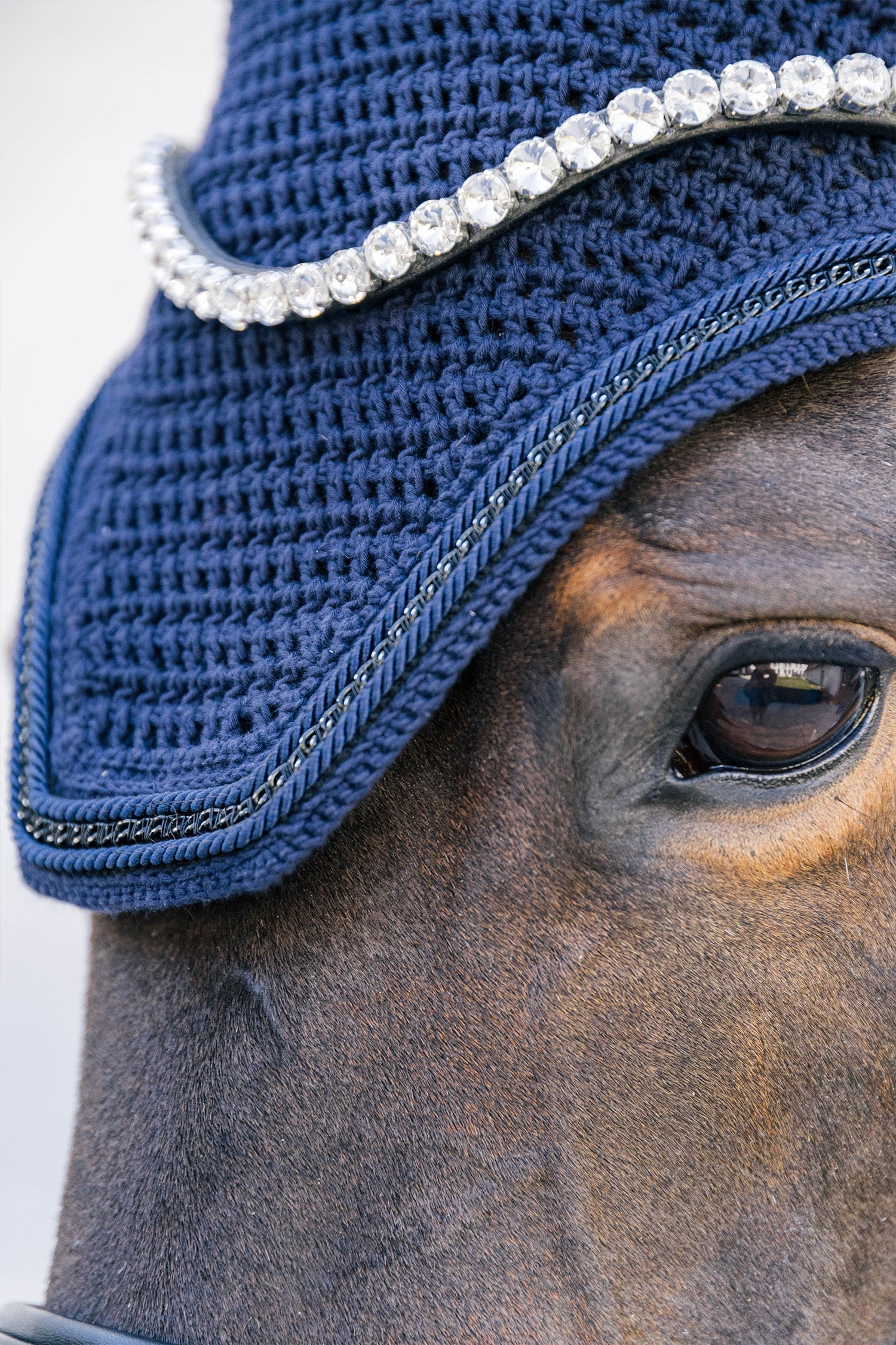 De elastische oren van rekbaar materiaal zorgen voor een perfecte pasvorm en dempen storende geluiden, waardoor het oornet ideaal is voor paarden die extra focus nodig hebben tijdens training en wedstrijd. De elegante metalen ketting langs de rand geeft een luxe en moderne uitstraling die de aandacht trekt in de wedstrijdring.