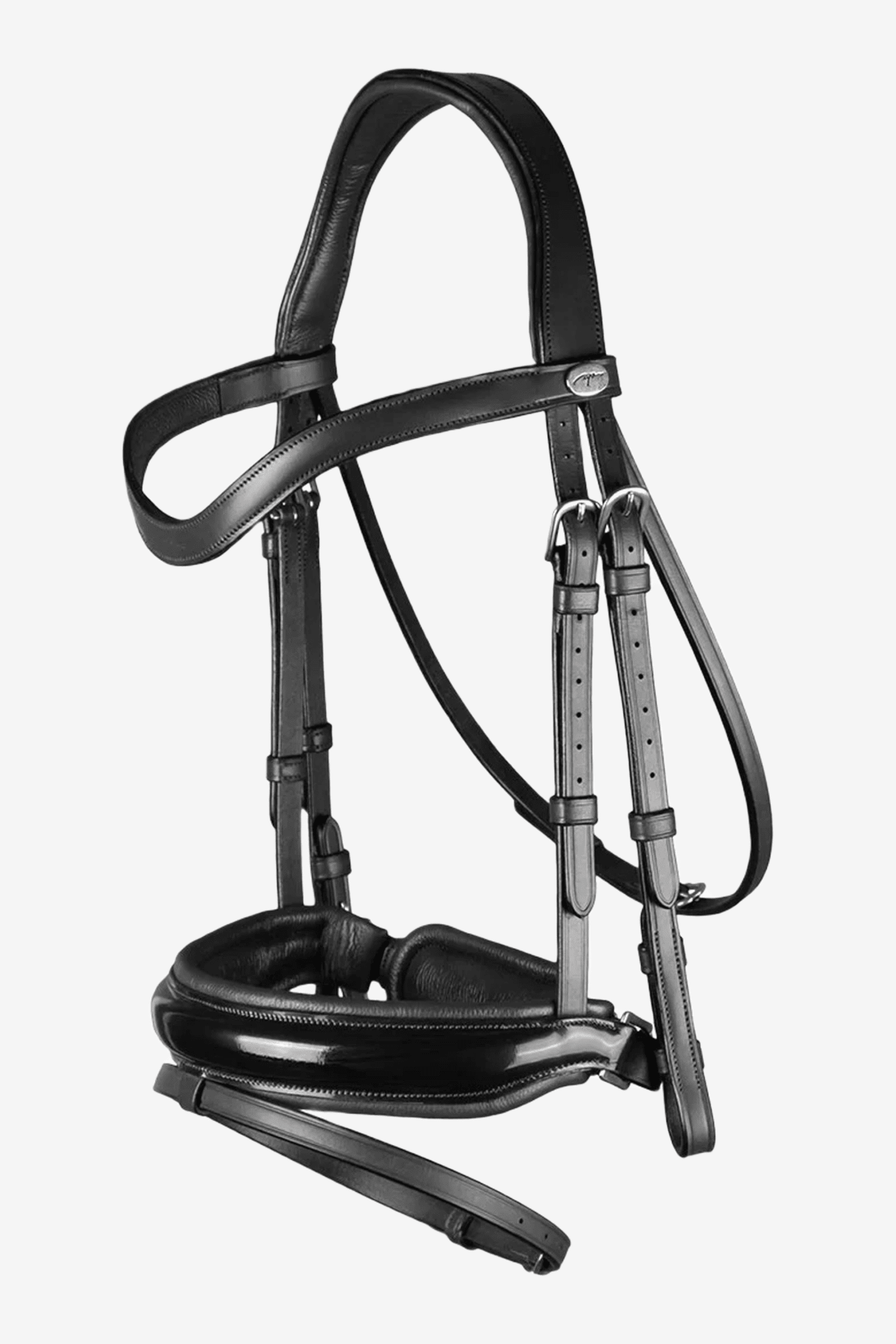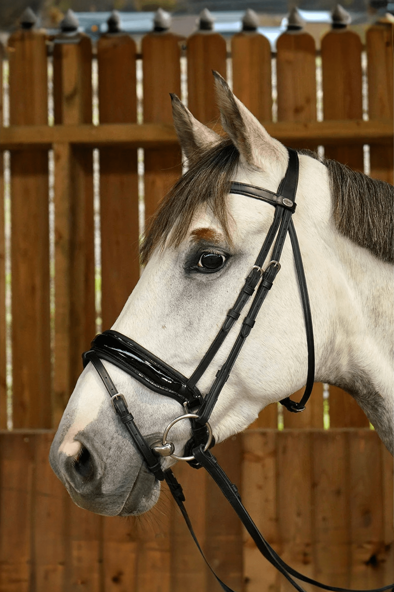 Dy’on Patent Crank Hoofdstel met Brede Neusriem en Sperriem – een hoofdstel dat veel comfort, stabiliteit en een elegant design biedt, perfect voor zowel training als wedstrijd.