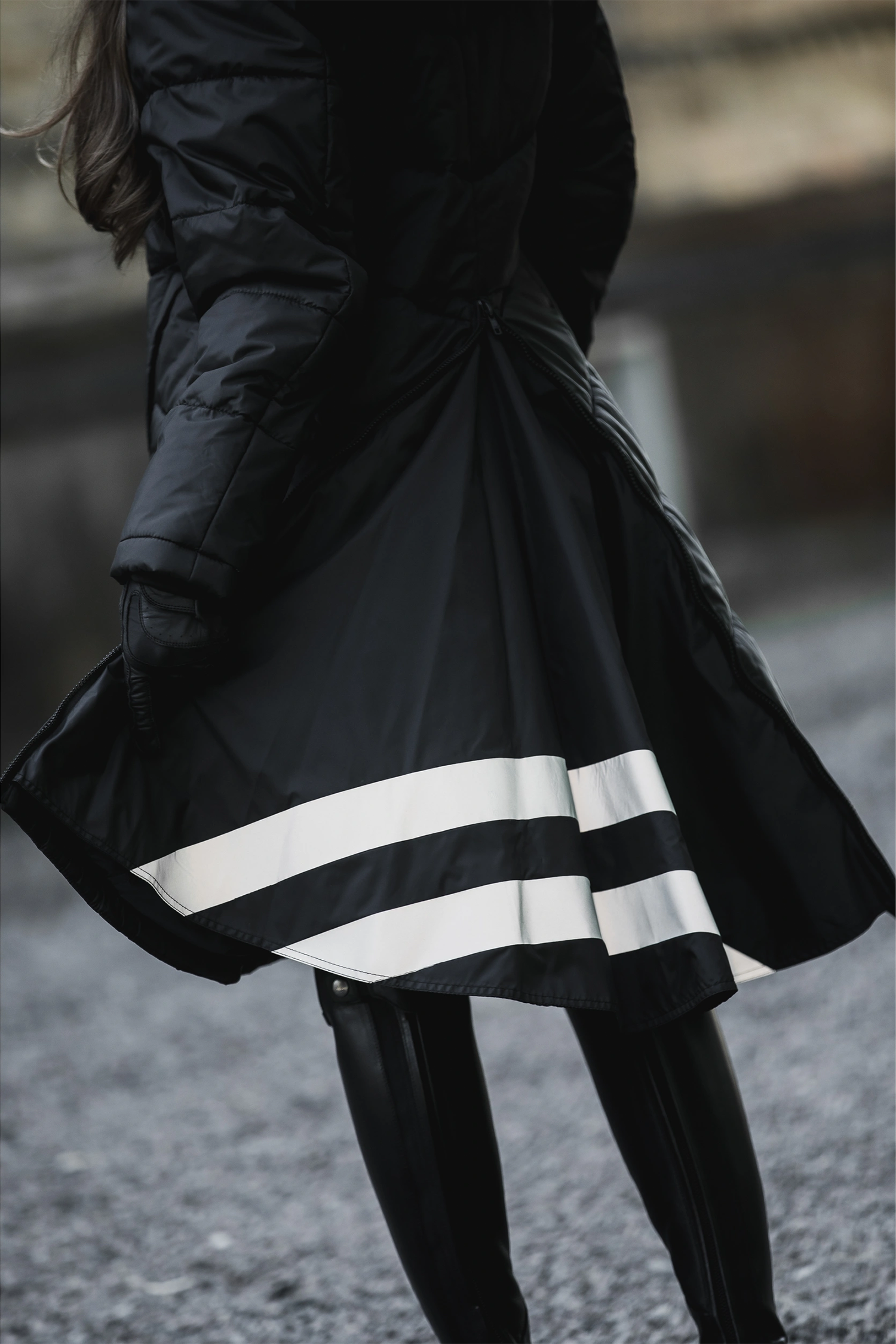 Verstelbare beenbanden die de jas op zijn plaats houden, zelfs in galop