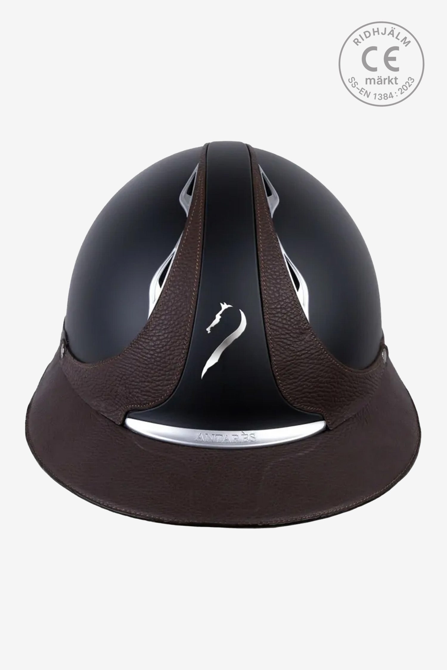 Kask jeździecki Antarès Reference w matowym czarnym wykończeniu z brązowymi skórzanymi detalami łączy elegancki wygląd z maksymalnym komfortem.