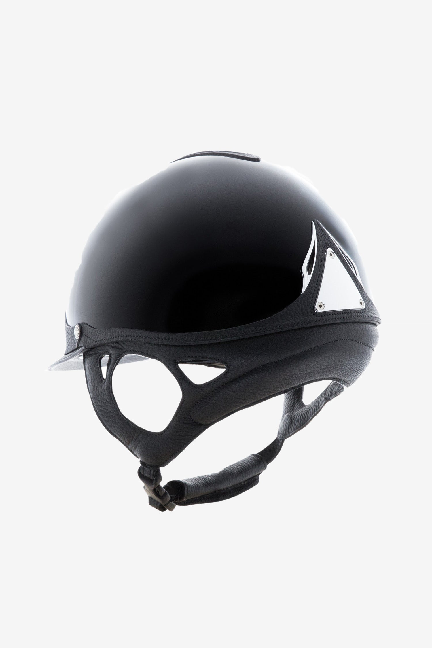 Kask jeździecki z błyszczącym wykończeniem i detalami z chromu.