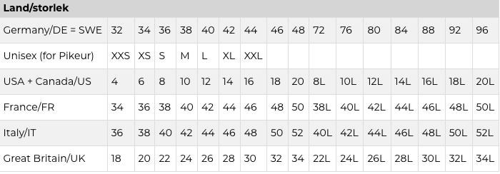 Zakup w rozmiarach francuskich; zobacz poniższą tabelę, aby porównać z rozmiarami szwedzkimi.