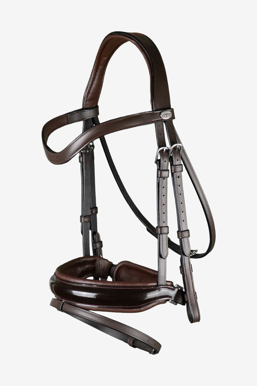 Ogłowie posiada nachrapnik typu crank z miękkim podszyciem, które równomiernie rozkłada nacisk i zwiększa komfort konia. Odczepiany skośnik daje elastyczność i dodatkowe wsparcie w razie potrzeby, a anatomicznie wyprofilowany nagłówek zapewnia dobre dopasowanie oraz swobodę uszu i szyi konia.