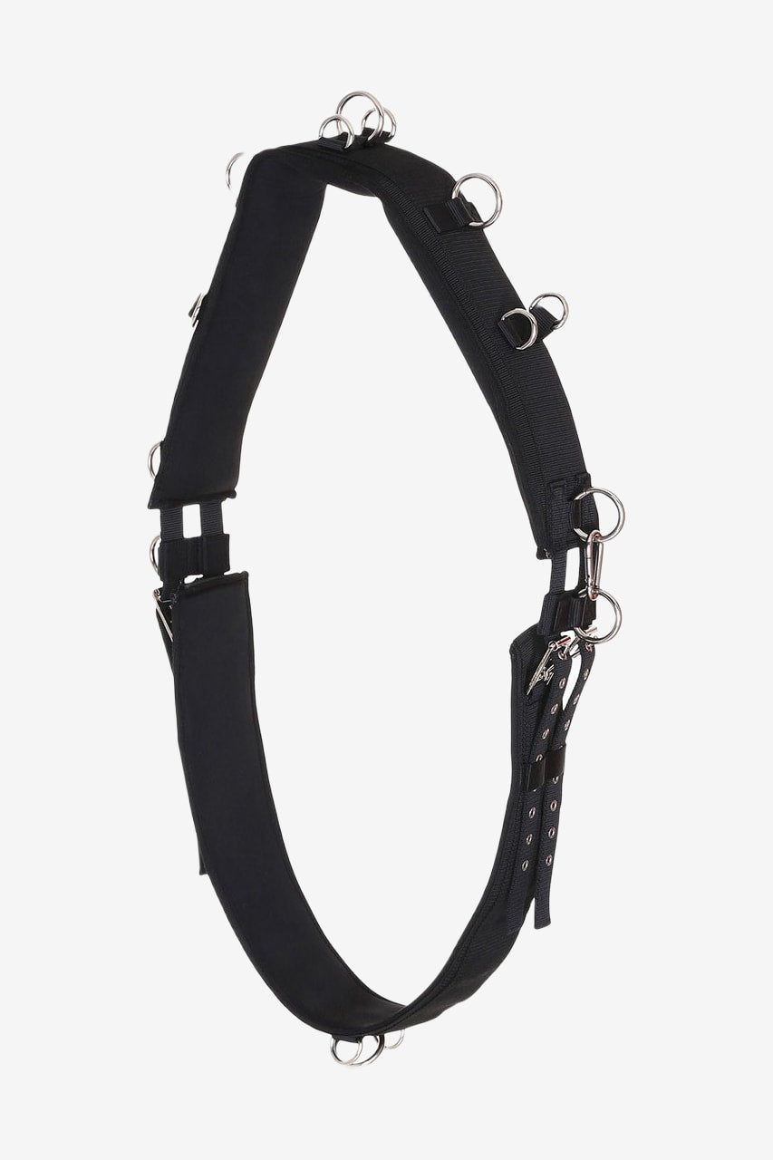 Pas do lonżowania HorseGuard w klasycznej czerni z miękkim wnętrzem z neoprenu. Kilka praktycznych kółek i zaczepów umożliwia szeroki zakres zastosowań podczas pracy z koniem z ziemi.