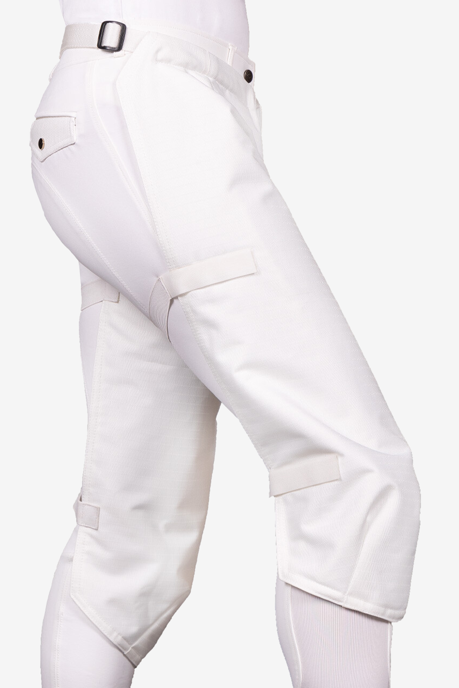 Ochronę łatwo założyć i zdjąć, a zapinana jest wokół talii za pomocą regulowanego paska z plastikową klamrą. Na udzie i pod kolanem znajdują się praktyczne zapięcia na rzepy, które utrzymują ochronę stabilnie na miejscu podczas jazdy.