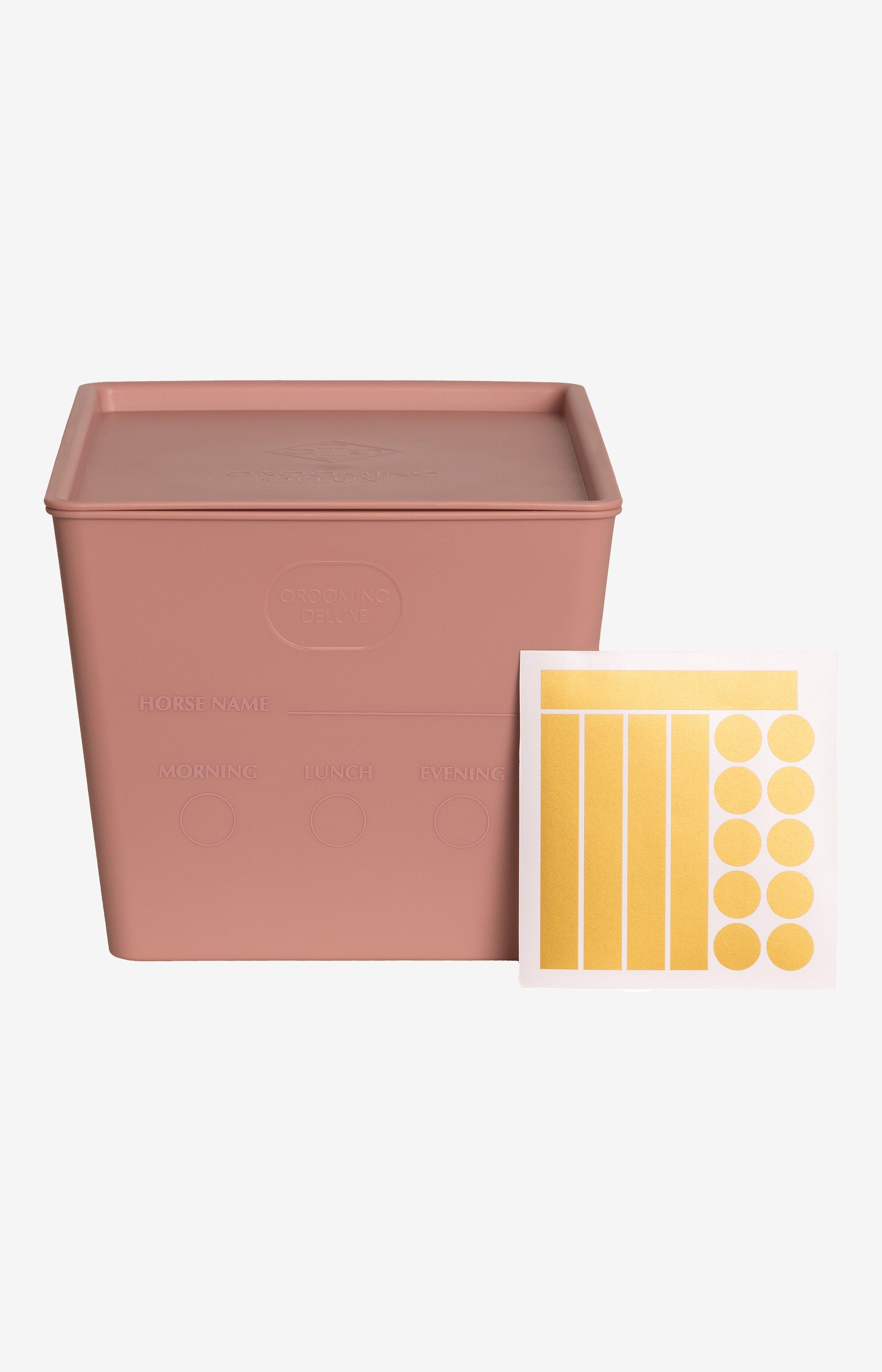 Praktycznym rozwiązaniem jest możliwość oznaczenia pojemnika imieniem konia i posiłkiem dzięki dołączonym naklejkom oraz grawerowanej powierzchni pojemnika. Pojemnik może być również używany bezpośrednio podczas karmienia, co czyni go wyjątkowo elastycznym w codziennym użytkowaniu.