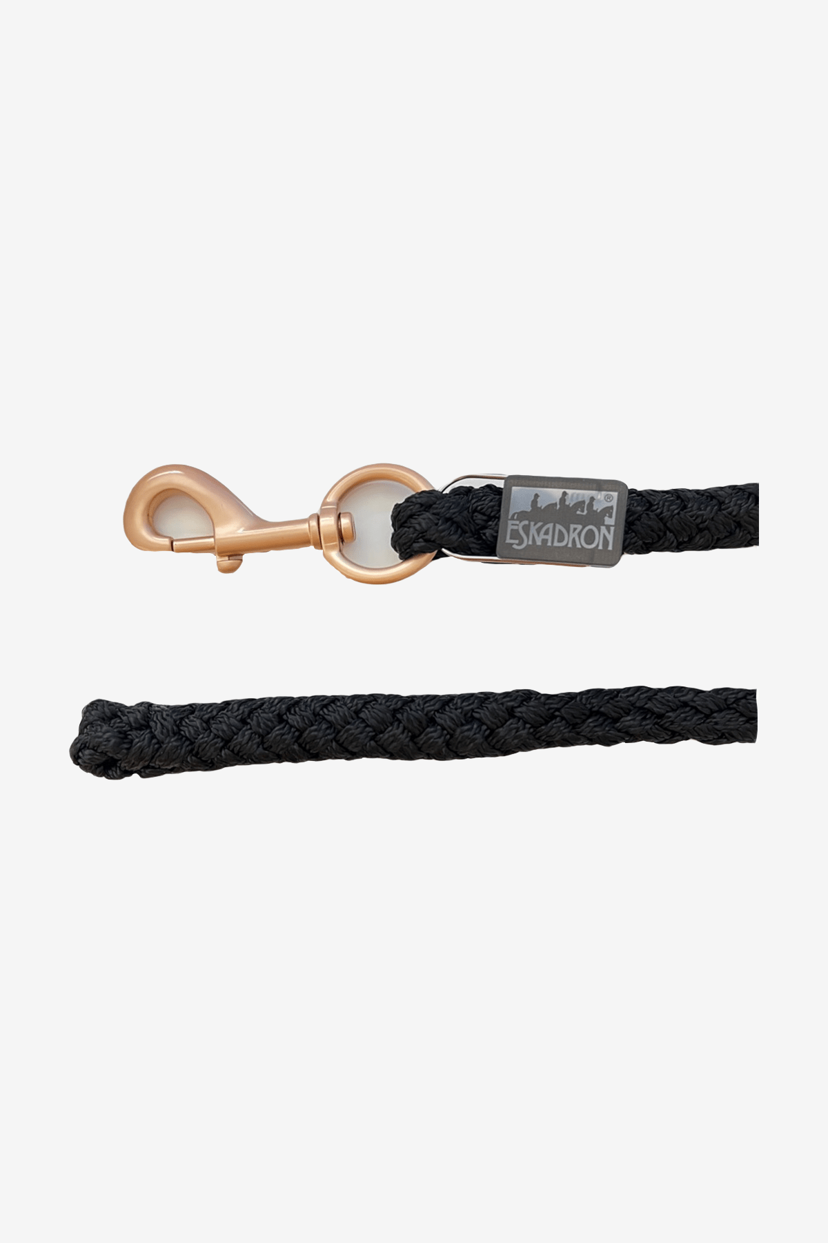 Uwiąz od Eskadron. Elastyczny uwiąz w grubszej wersji z karabińczykiem w kolorze różowego złota. Wykonany z wytrzymałego materiału z obrotowym hakiem. Posiada również metkę, na której można napisać swoje lub imię konia i/lub numer telefonu.
