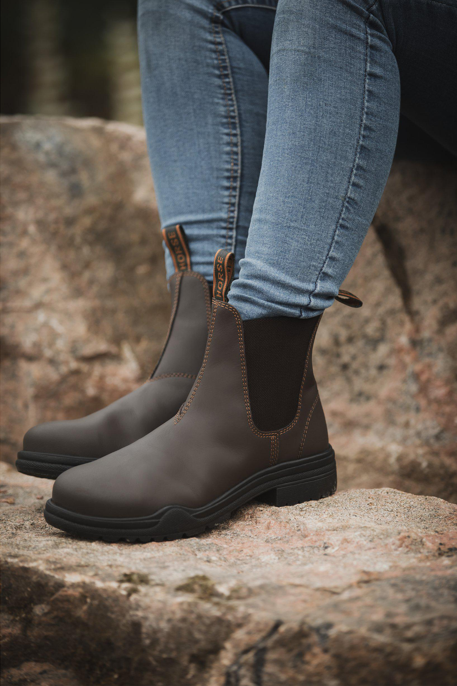 Mocna elastyczna wstawka po bokach ułatwia zakładanie i zdejmowanie buta, a solidna podeszwa z bieżnikiem i amortyzującym obcasem zapewnia doskonałą przyczepność i wygodę zarówno w strzemieniu, jak i na podłodze stajni.