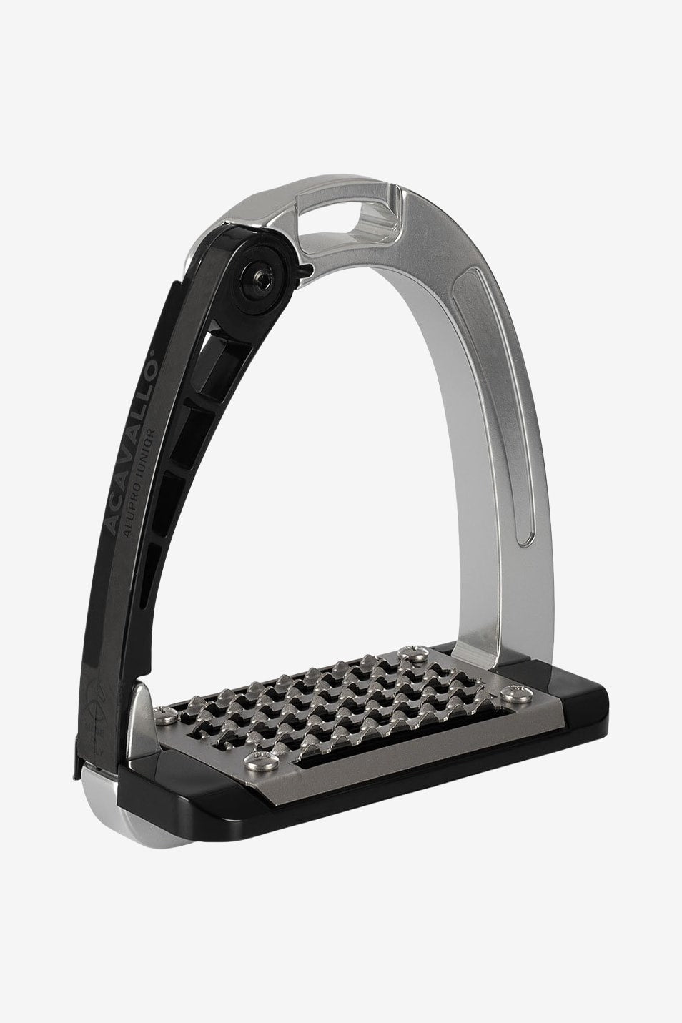 En sikkerhedsstigbøjle med en yderbue af aluminium og arm samt en nedre stigbøjleplade af specielt polyamidmateriale.